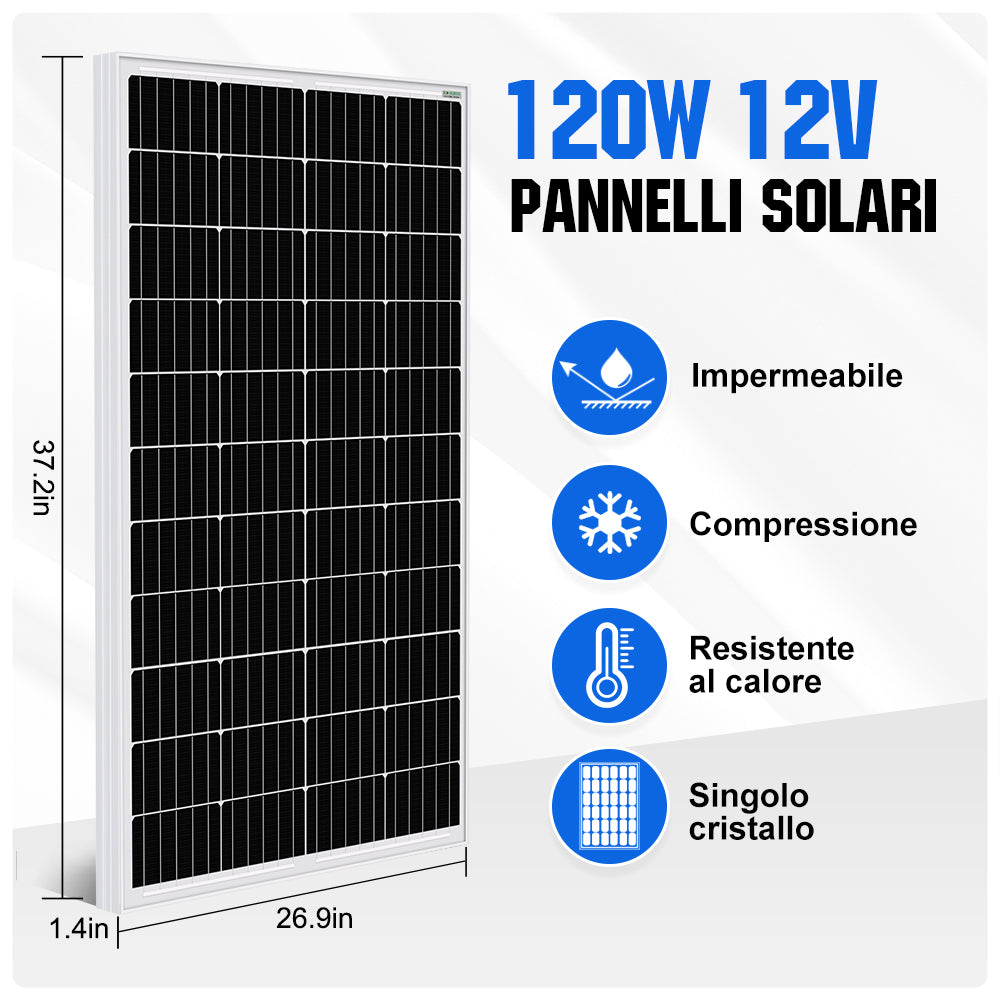 I moduli solari dell'ECO-WORTHY 120W sono moduli di alta qualità con celle monocristalline, eccellente comportamento alla luce debole nelle giornate nuvolose, al mattino e alla sera. Il modulo solare è costituito da vetro solare temprato resistente alla grandine con rivestimento resistente alle intemperie, il telaio è in alluminio anodizzato e le connessioni sono resistenti alle intemperie, quindi protette in modo ottimale da vento e intemperie. 25 anni di garanzia sulle prestazioni.