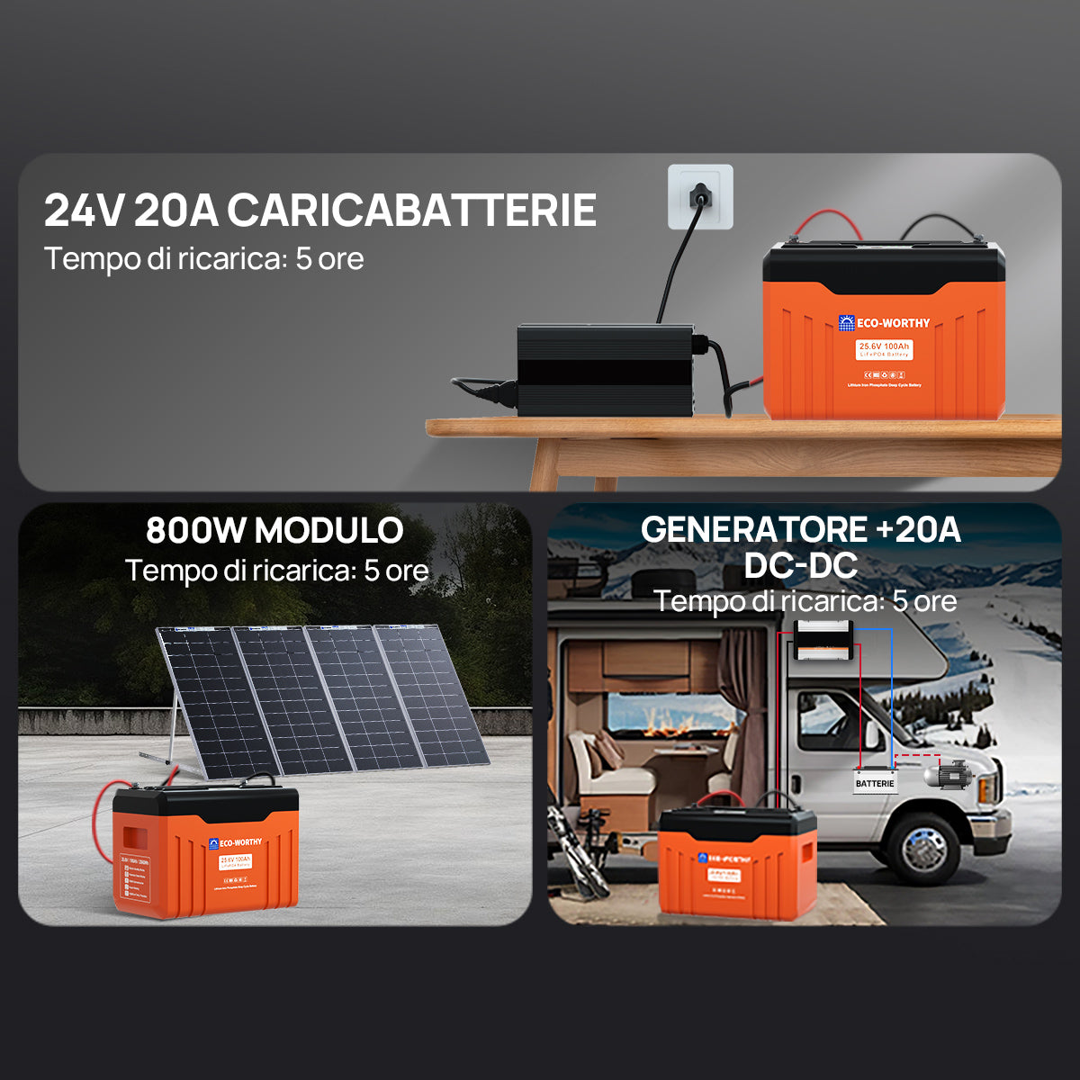 ·[Monitoraggio Bluetooth]: collega la batteria ECO-WORTHY 100Ah LiFePO4 24V tramite Bluetooth per il monitoraggio remoto. Con l'app, puoi monitorare corrente, tensione, potenza, SOC e SOH in tempo reale.