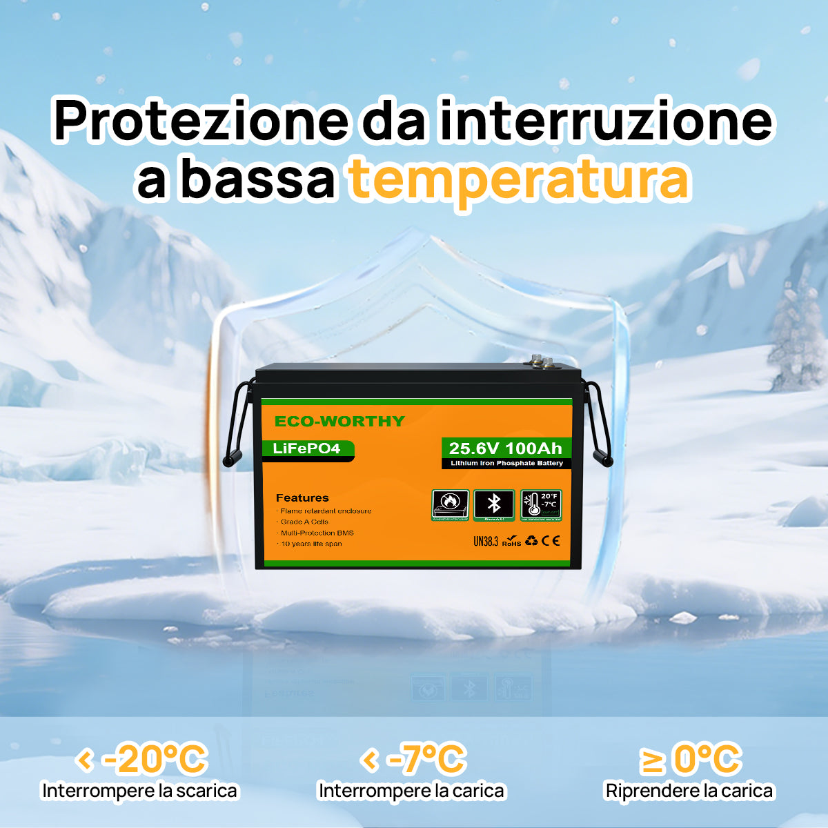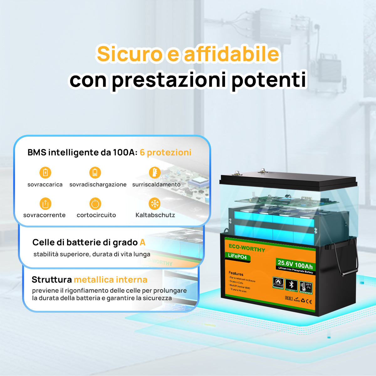 ·Assolutamente intrinsecamente sicure: le batterie LiFePO4 sono una delle fonti di alimentazione più sicure e affidabili sul mercato. La protezione BMS integrata garantisce un elevato livello di sicurezza per la batteria e l'utente.