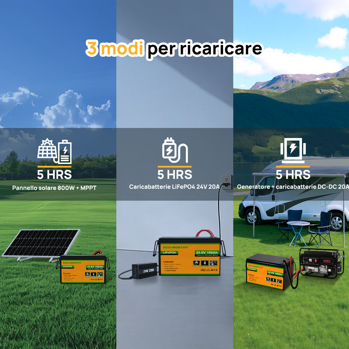 | Capacità della batteria: 100Ah | Potenza della batteria: 2560Wh |