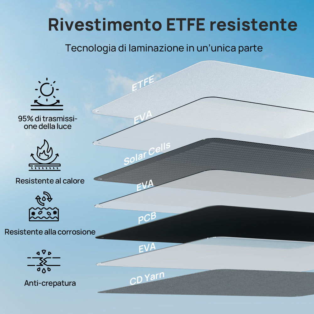 Alta efficienza del 23%:Questo pannello solare portatile da 100 W utilizza celle in silicio monocristallino di classe A con tecnologia PERC, migliorando l'assorbimento e la riflessione della luce solare per raggiungere un'elevata efficienza del 23% e una produzione di energia superiore. Ampia compatibilità con i dispositivi:Dotato di un cavo integrato da 150 cm (XT60/DC7909/DC8020), il nostro pannello solare pieghevole si collega facilmente alla maggior parte delle stazioni di alimentazione e dei dispositivi per campeggio, viaggi in camper e ricarica all'aperto. Robusto e durevole:La sua struttura rinforzata a 7 strati con incapsulamento laminato garantisce una maggiore durata. Rivestimento in ETFE per prestazioni impermeabili e antipolvere e maggiore durata in condizioni esterne difficili. Supporto regolabile per una maggiore efficienza: il pannello solare pieghevole da 100 W è dotato di un supporto multi-angolare integrato per ottimizzare l'esposizione al sole e aumentare l'efficienza di raccolta dell'energia di oltre il 25%. Portatile e versatile: questo pannello solare da viaggio pesa solo 3,8 kg e si ripiega in modo compatto (160 x 260 x 1 cm). I fori di montaggio e il supporto consentono un rapido utilizzo per escursioni, pesca, attività fuori dalla rete elettrica e altro ancora. Sistema di alimentazione espandibile: il pannello solare portatile da 100 W supporta connessioni in serie/parallelo per combinare più pannelli, adattando la potenza in uscita per soddisfare un maggiore fabbisogno energetico.