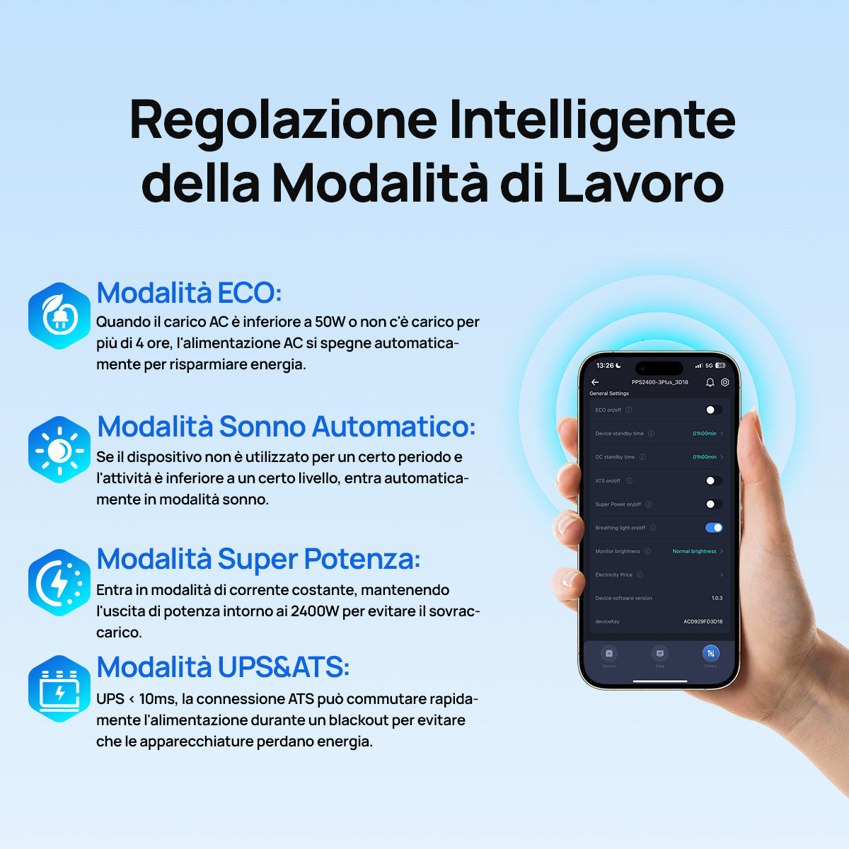 [Controllo Wi-Fi e Bluetooth] : Supporta connettività Wi-Fi e Bluetooth per monitoraggio e gestione remota della powerstation tramite applicazione. Controlla lo stato operativo in tempo reale, gestisci le impostazioni e ottimizza il consumo energetico direttamente dal tuo smartphone.