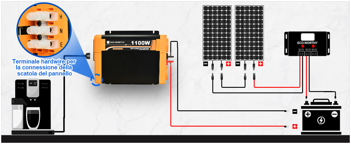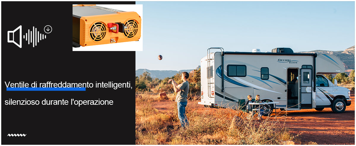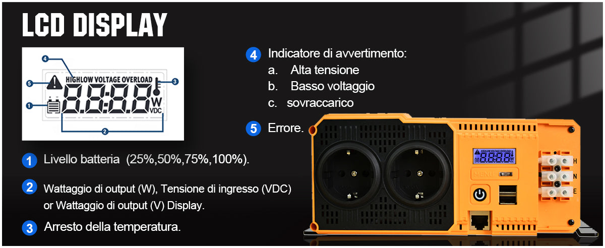 ·Display LCD e ventola intelligente: è possibile utilizzare il display per controllare il livello della batteria. Una ventola intelligente protegge l'inverter dal surriscaldamento.