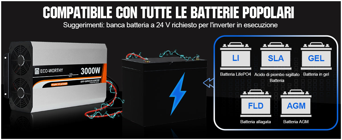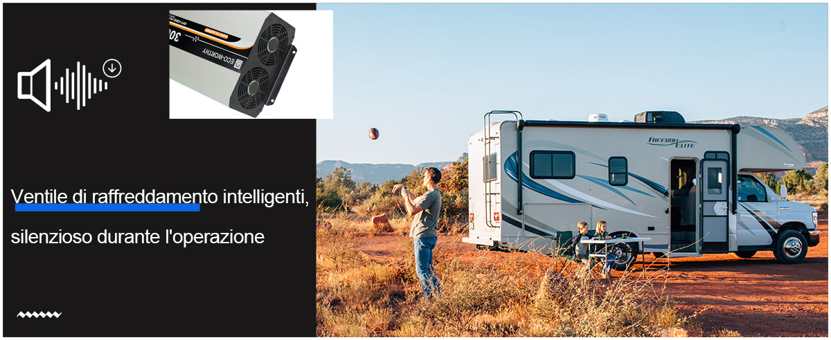 ·Display LCD e ventola intelligente: è possibile utilizzare il display per controllare il livello della batteria. Una ventola intelligente protegge l'inverter dal surriscaldamento.