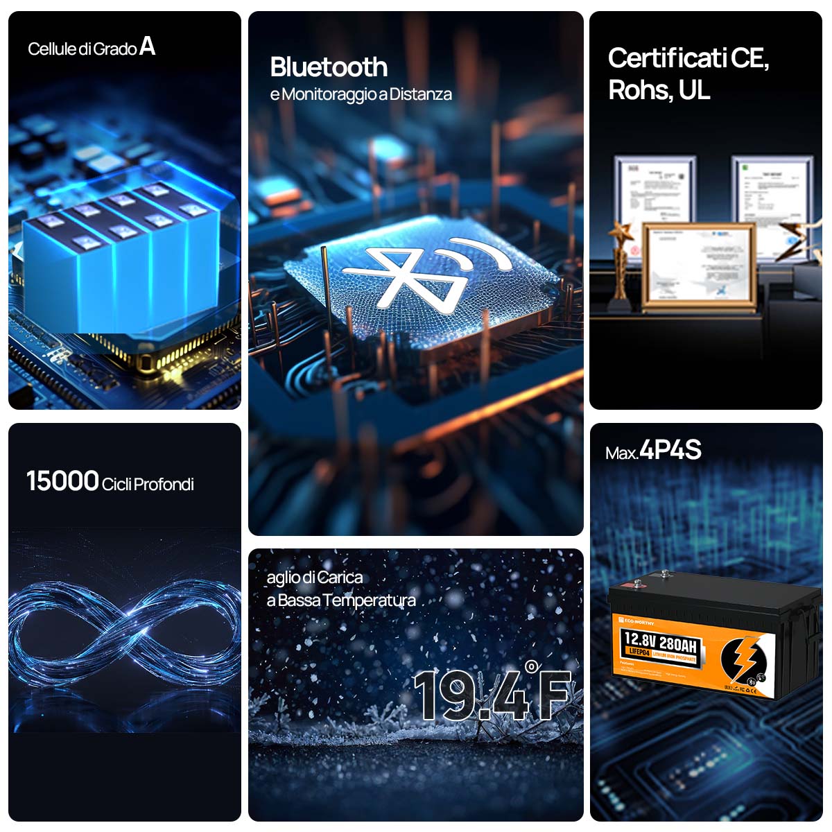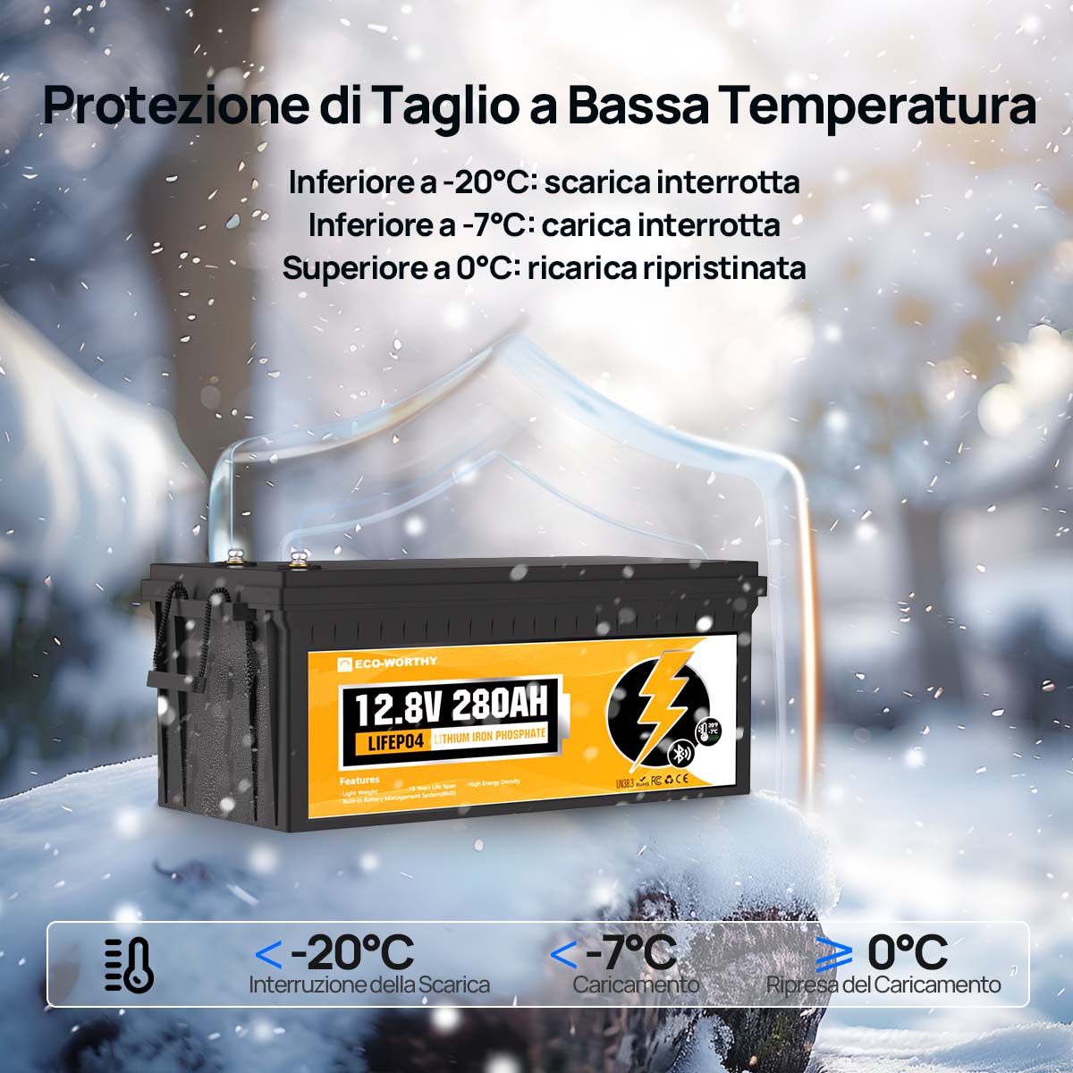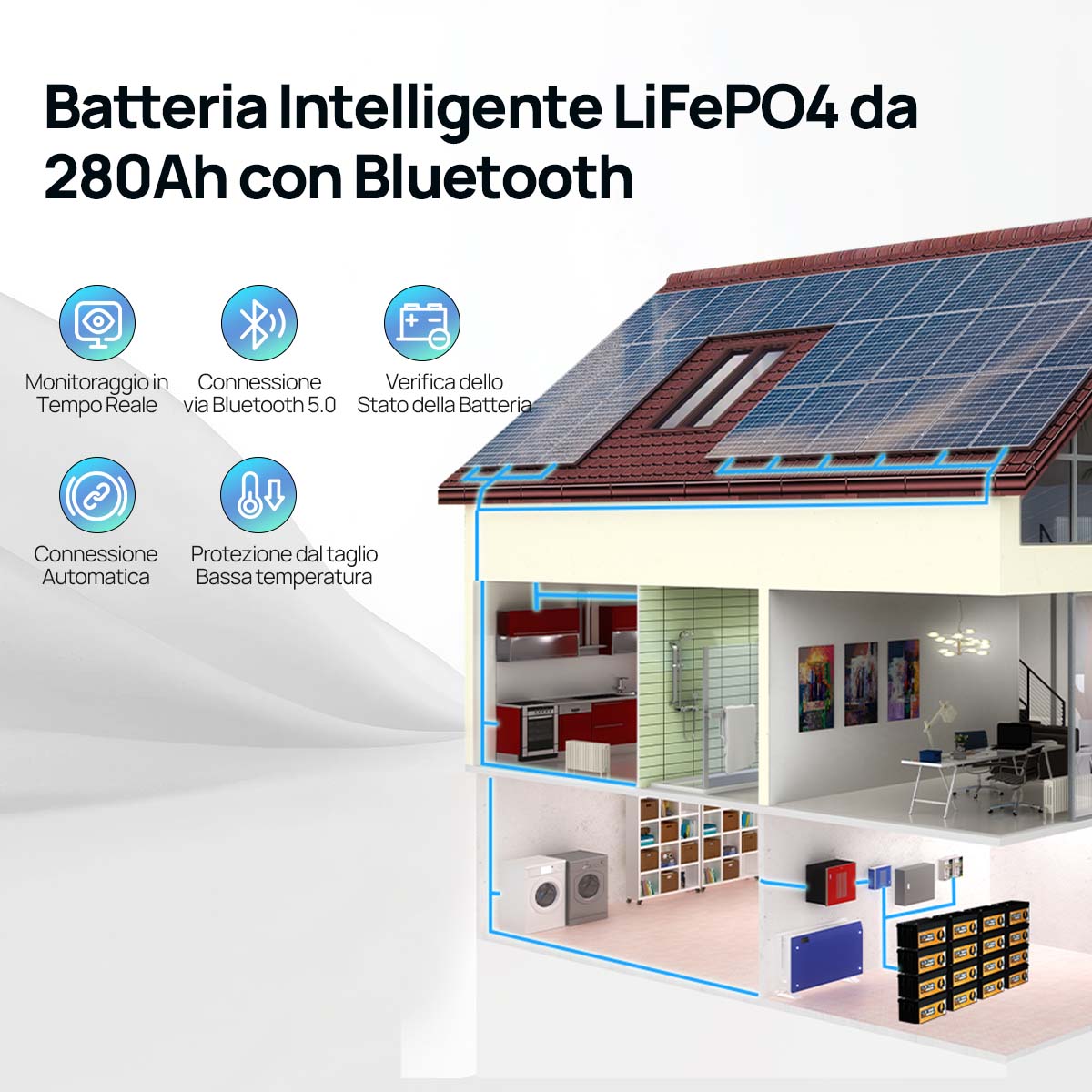 Batteria al litio LiFePO4 12V 280Ah con Bluetooth e protezione dalle basse temperature