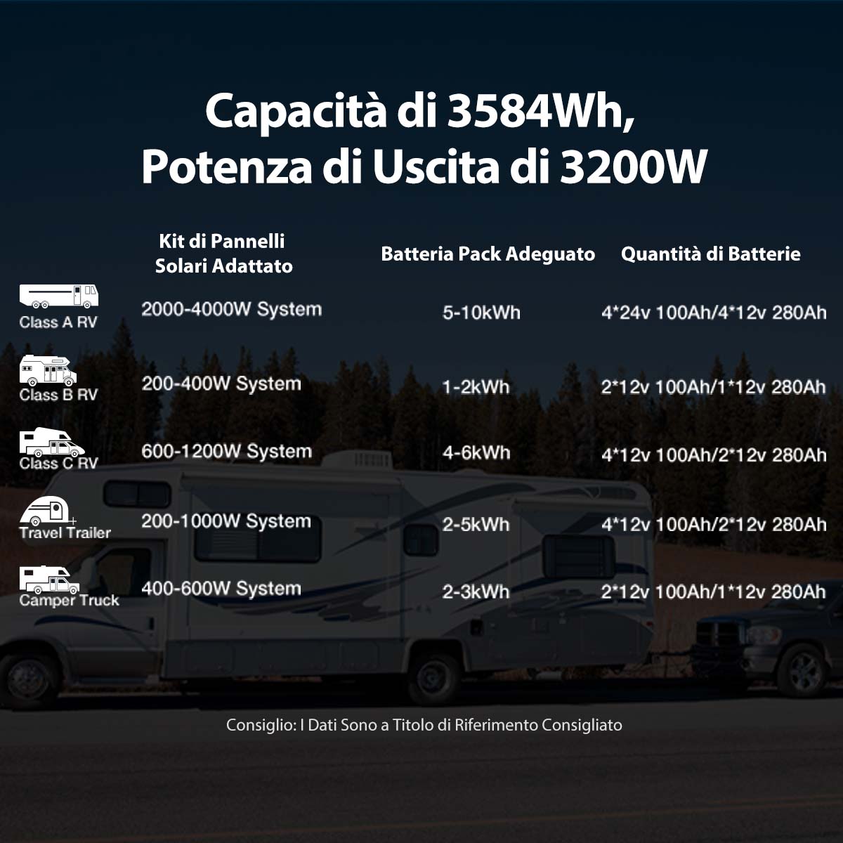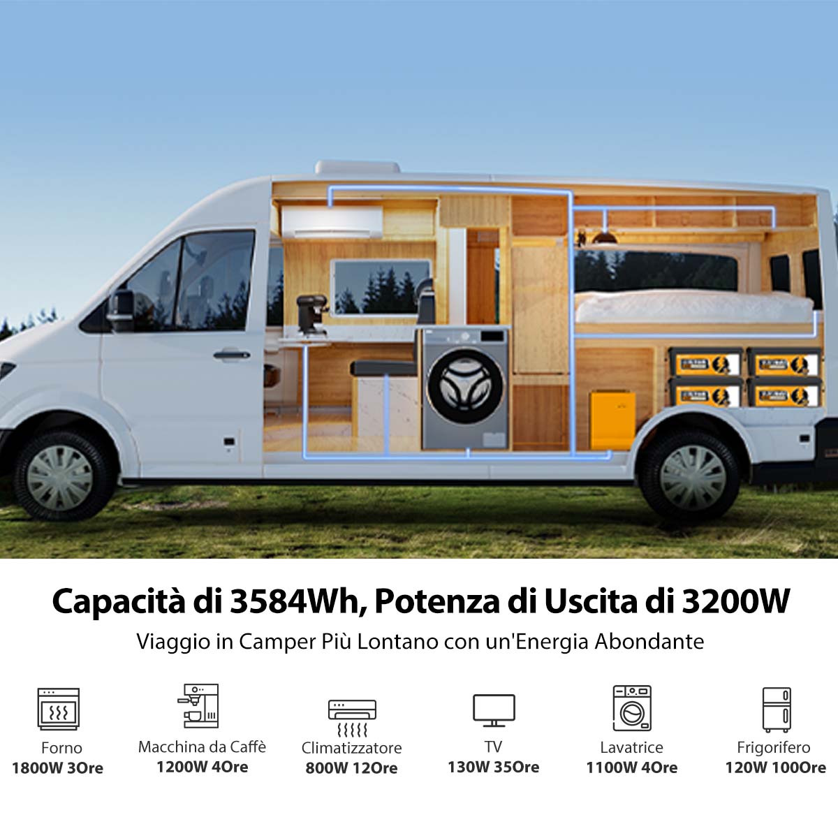 · 3584 Wh di energia utilizzabile. Alimenta senza problemi un frigorifero da camper, una macchina per il caffè, un microonde o l'illuminazione del tuo impianto solare.