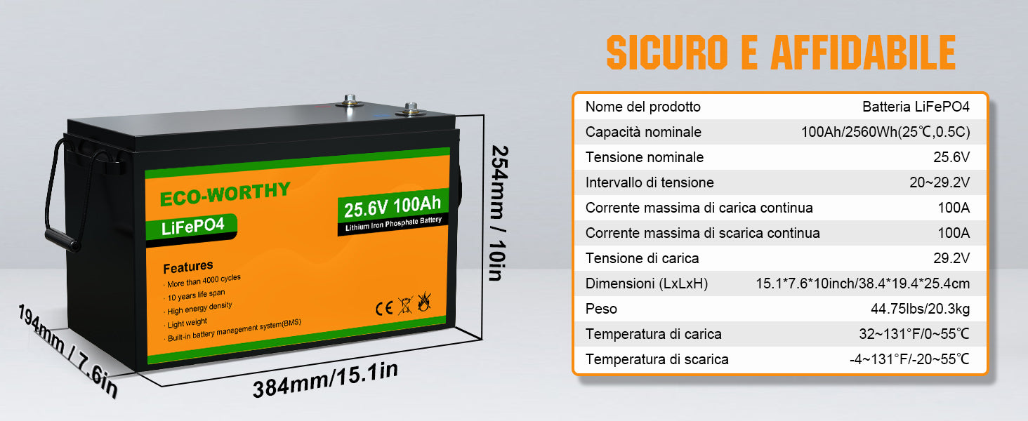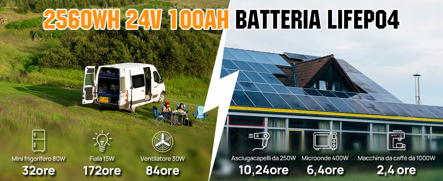 Capacità della batteria: 100Ah | Potenza della batteria: 2560Wh |