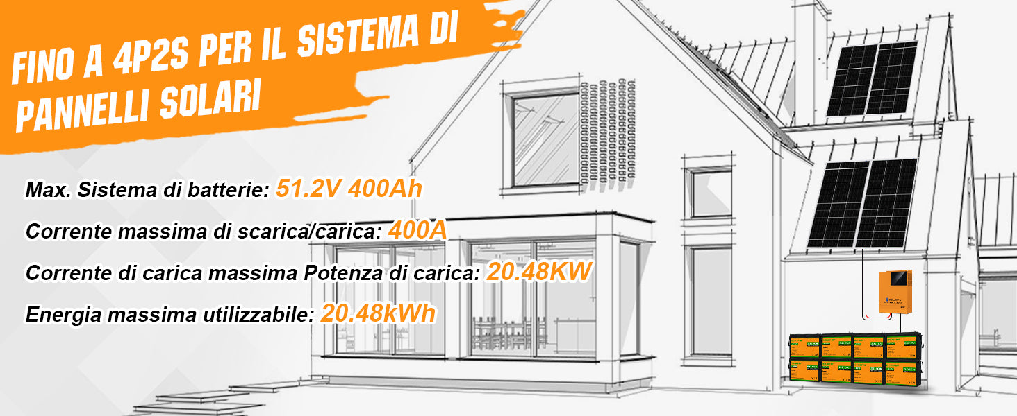 Tensione della batteria: 25.6V | Corrente massima di carica/scarica: 100A/100A |