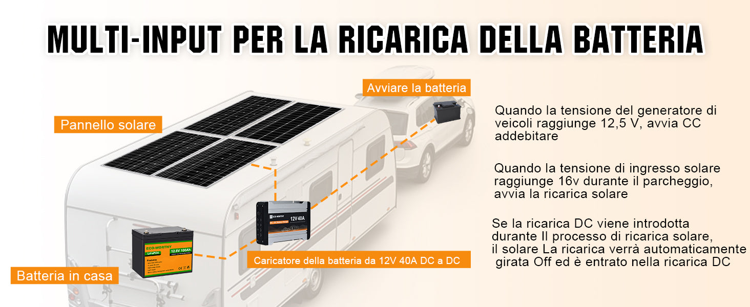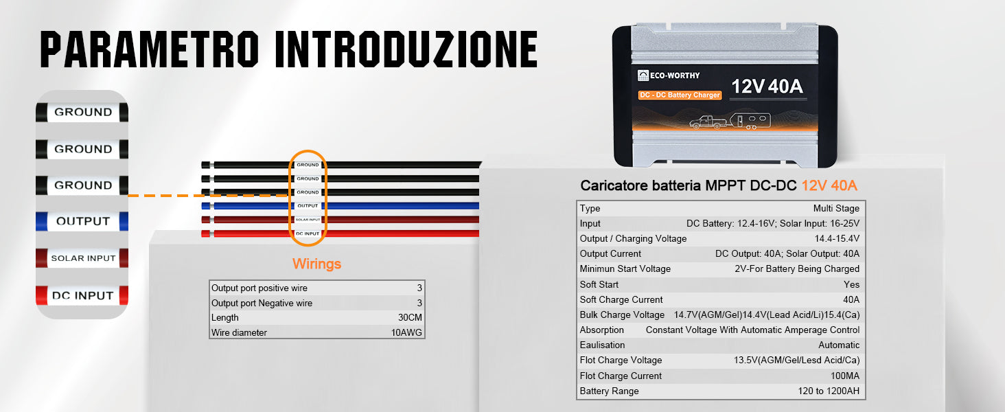 Tensione di output / di ricarica: 14.4-15.4V | Corrente di uscita: DC Output: 40A; Output solare: 40A |