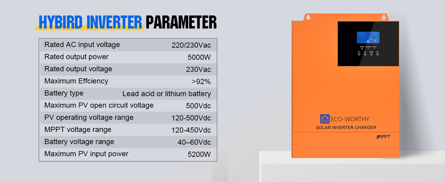 ECO-WORTHY Inverter All-in-one Costruito in 5000W 48V Inverter di potenza a onda sinusoidale pura e controller MPPT 80A è un nuovo inverter di accumulo di energia solare ibrido che controlla la macchina all-in-one che integra l'accumulo di energia solare e l'accumulo di energia di ricarica dell'energia commerciale e il seno AC uscita dell'onda. Adotta il controllo DSP e dispone di algoritmi di risposta avanzati e alta affidabilità attraverso algoritmi di controllo avanzati. Ed elevati standard di industrializzazione. Esistono solo quattro modalità di ricarica: energia solare, priorità di alimentazione della città, priorità di energia solare, alimentazione della città e energia solare. Tre modalità di uscita: modalità priorità energia solare, modalità priorità potenza rete, modalità priorità inverter, sono disponibili per soddisfare le diverse esigenze applicative.