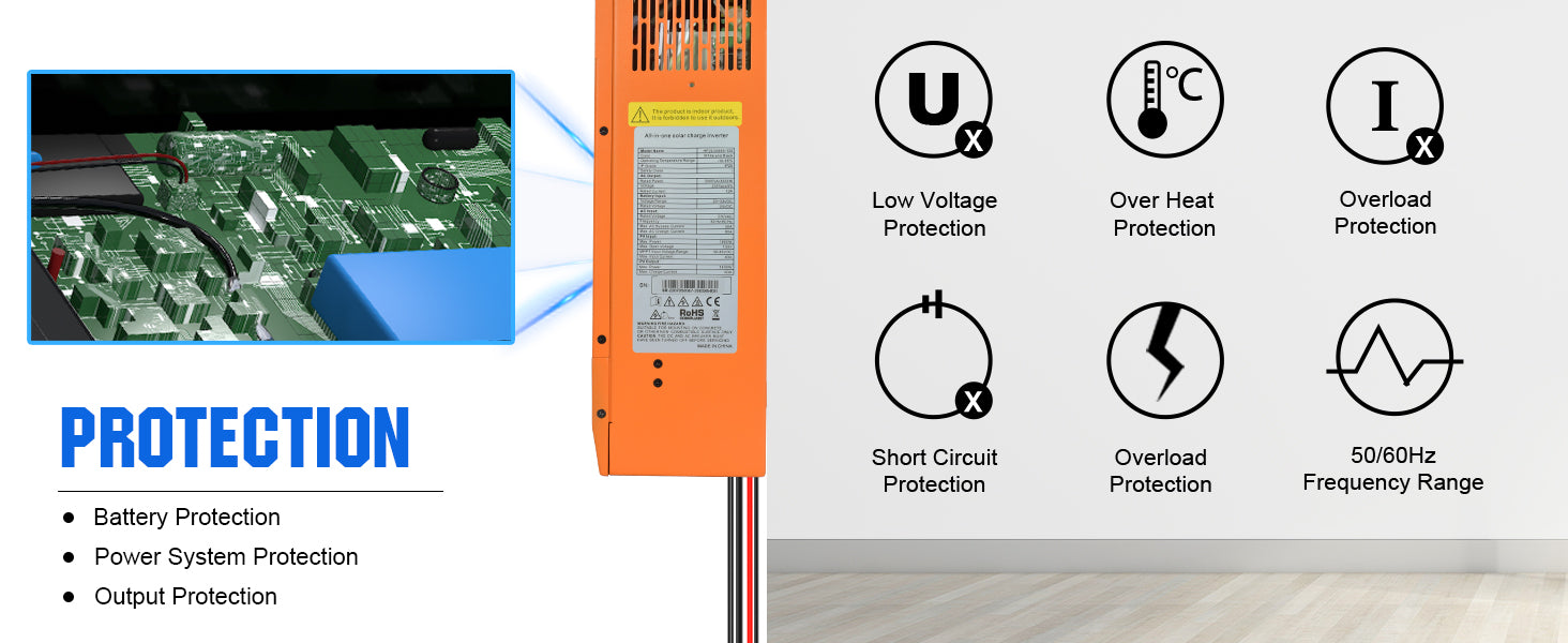 ·Inverter ibrido: la combinazione di inverter a onda sinusoidale pura da 5000W 48V CC a 220V/230V CA e controller MPPT da 80A fornisce un'uscita stabile per i vostri apparecchi, riduce i cavi dell'energia solare, oltre il 95% di efficienza, massimizza l'utilizzo di energia e protegge la batteria da cortocircuito, sovratensione e sottotensione, sovraccarico, inversione.