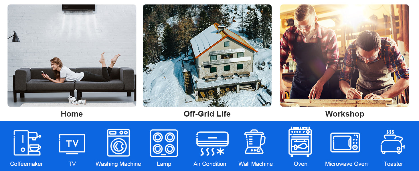 ·Applicazioni: è in grado di ottenere elettricità da una matrice di pannelli solari CC da 120-500V, da un generatore da 50/60Hz e da una rete CA da 220/230V. Alimentazione 5000W (10000VA di picco) per condizionatore, macchina per il caffè, frigorifero e altro. Il pacchetto contiene inverter ibrido solare all-in-one da 5000 W + moduli WiFi.