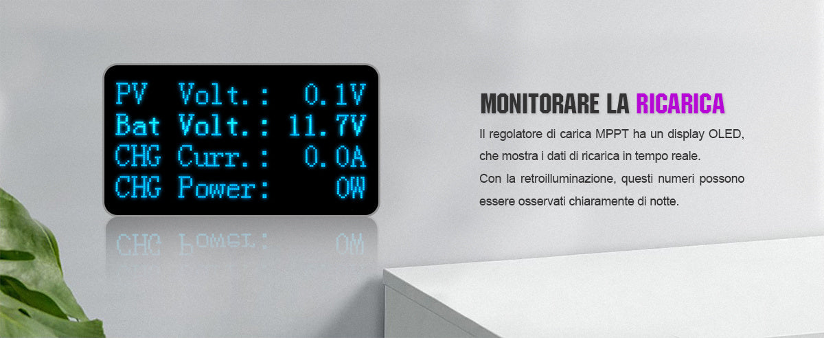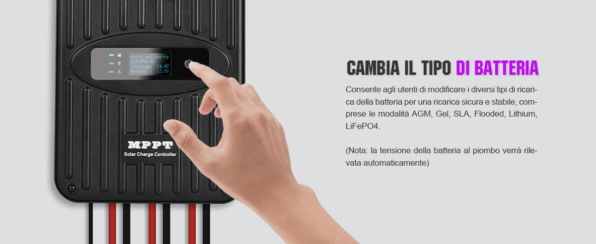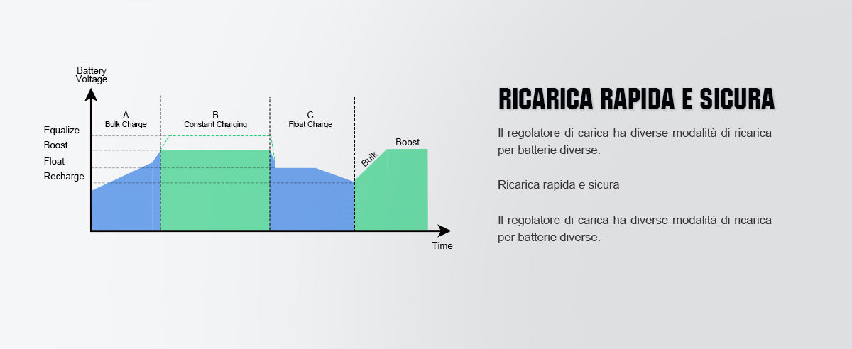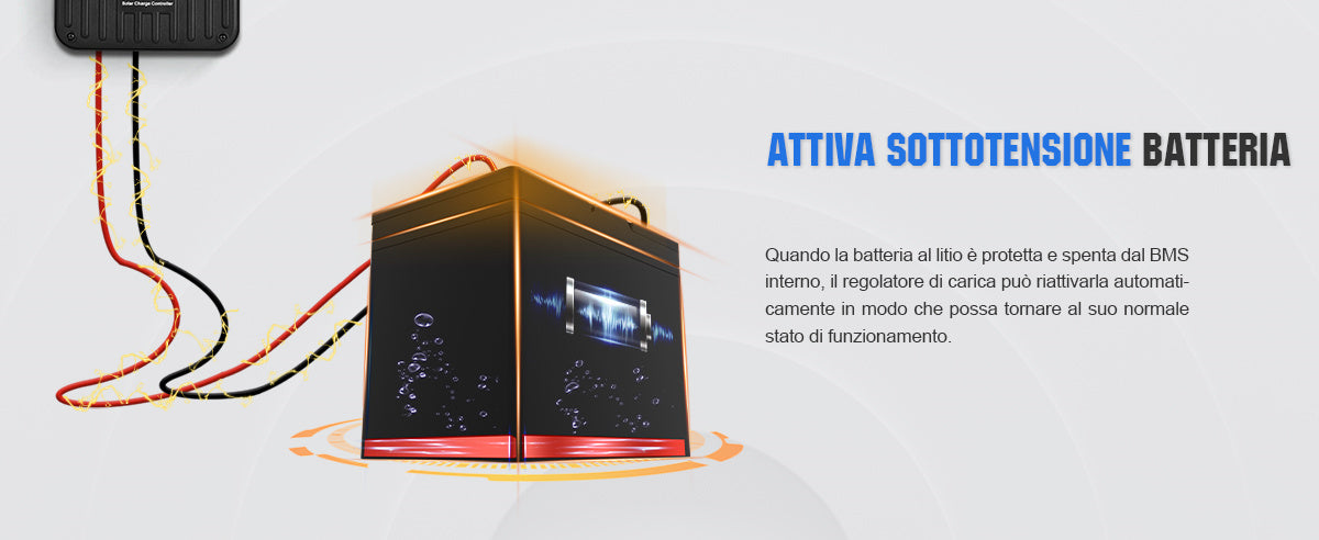 ·Protezione di carica intelligente: questo regolatore di carica MPPT offre una carica a 4 stadi (Bulk, Absorption, Float ed Equalization) e dispone di un set completo di protezioni elettroniche, come la prevenzione di sovraccarico e scarica eccessiva, sovratensione del pannello solare, sovraccarico, cortocircuito e protezione da inversione di polarità.