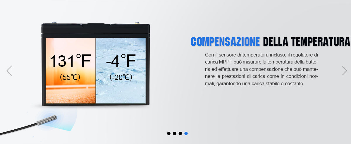 ·Monitoraggio e compensazione della temperatura: il design in alluminio pressofuso offre un'eccellente dissipazione del calore. Dotato di un sensore di temperatura remoto, il regolatore di carica MPPT può misurare la temperatura della batteria in tempo reale e utilizzare questi dati per una compensazione della temperatura estremamente accurata per garantire una carica stabile e costante.