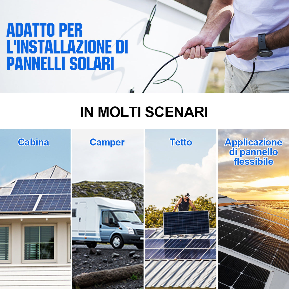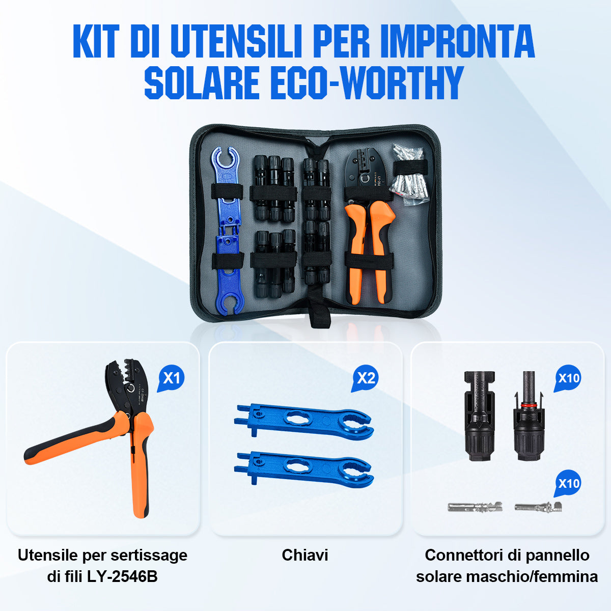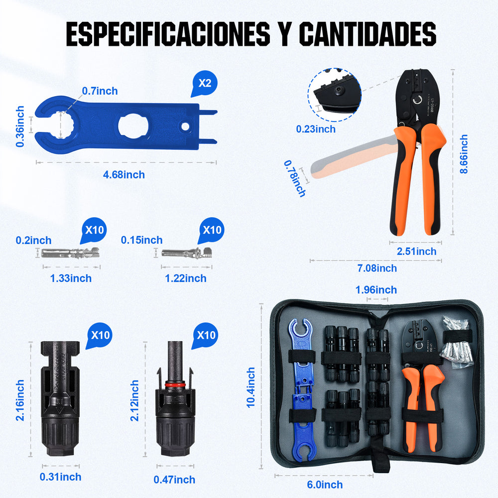Per l’installazione dei connettori solari, include 1 pinza crimpatrice, 2 chiavi, 10 paia di connettori per cavi solari, 10 connettori solari e 1 kit di attrezzi con chiusura lampo.