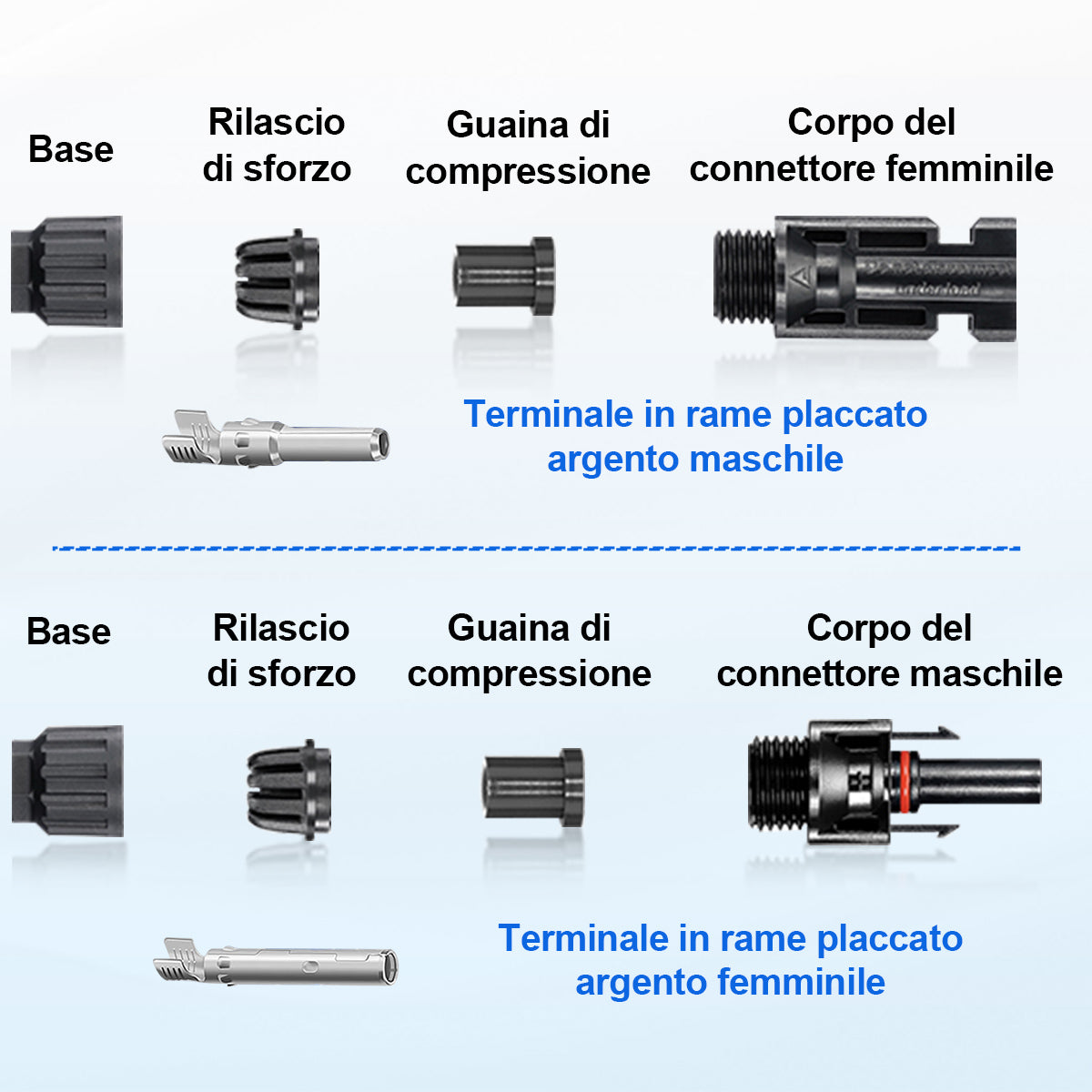 Realizzati in plastica PPO e rame stagnato, offrono eccellente resistenza all’invecchiamento e ai raggi UV. L’anello impermeabile assicura una perfetta protezione contro acqua e polvere (IP67).