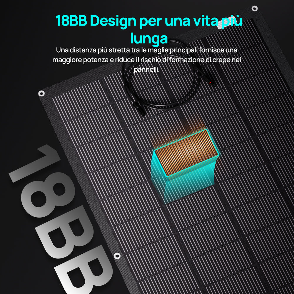 Tecnologia delle celle 18BB: barre di collegamento più sottili e ravvicinate rispetto ai tradizionali moduli 12BB, per una maggiore efficienza e una riduzione del rischio di micro-fessure.
