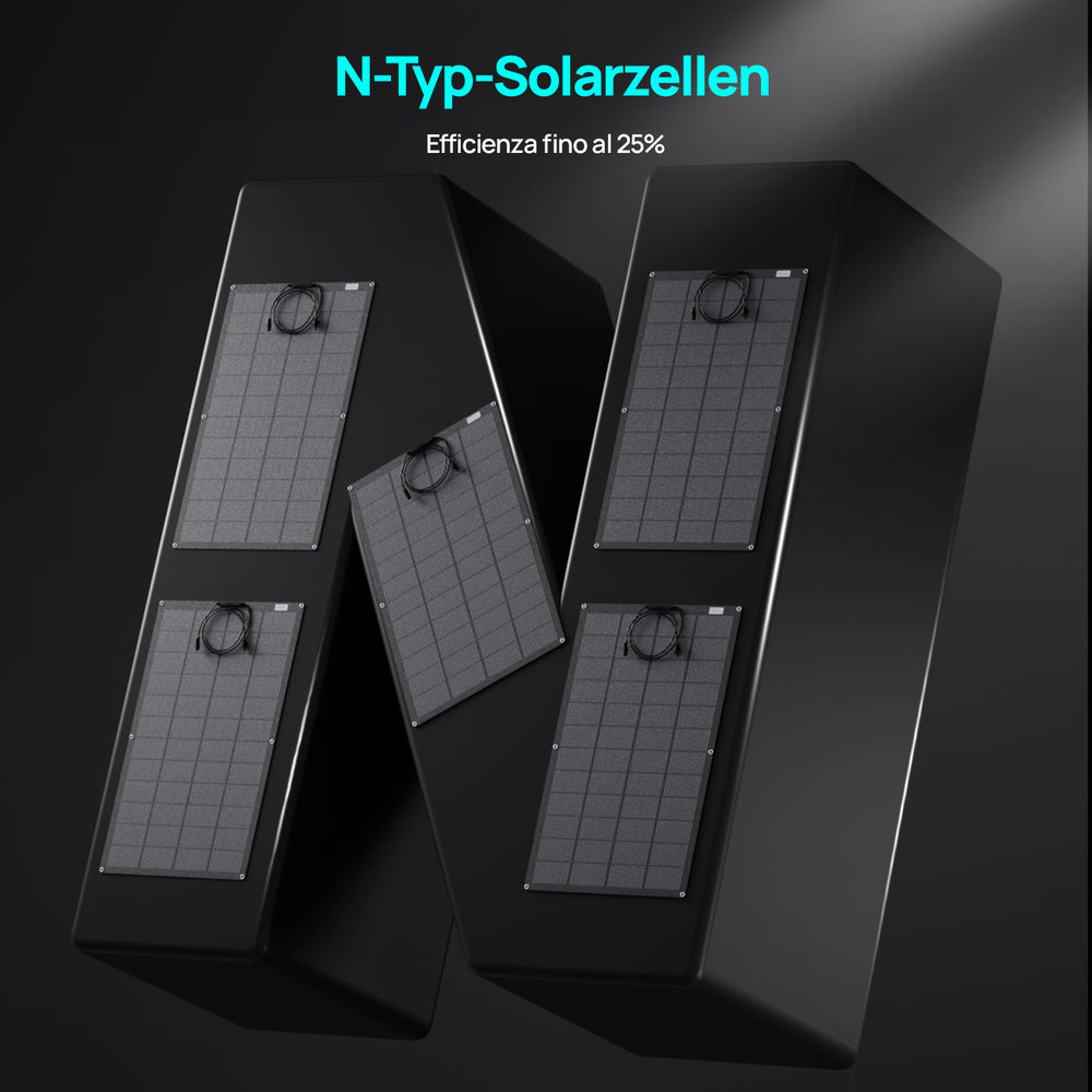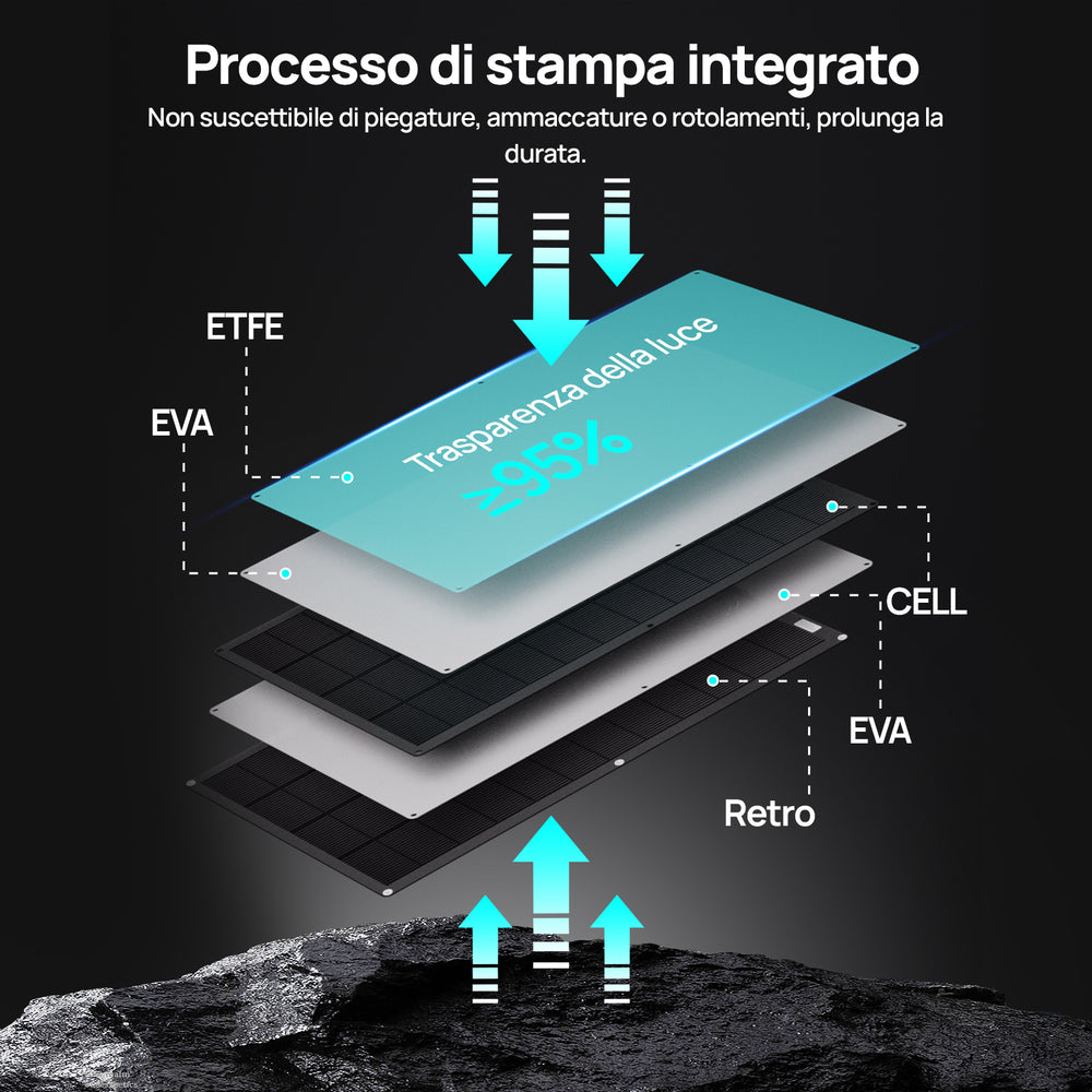 Elevato tasso di conversione (25%): celle di tipo N combinate con pellicola ETFE ad alta trasparenza (>95%) per massimizzare la produzione di elettricità.