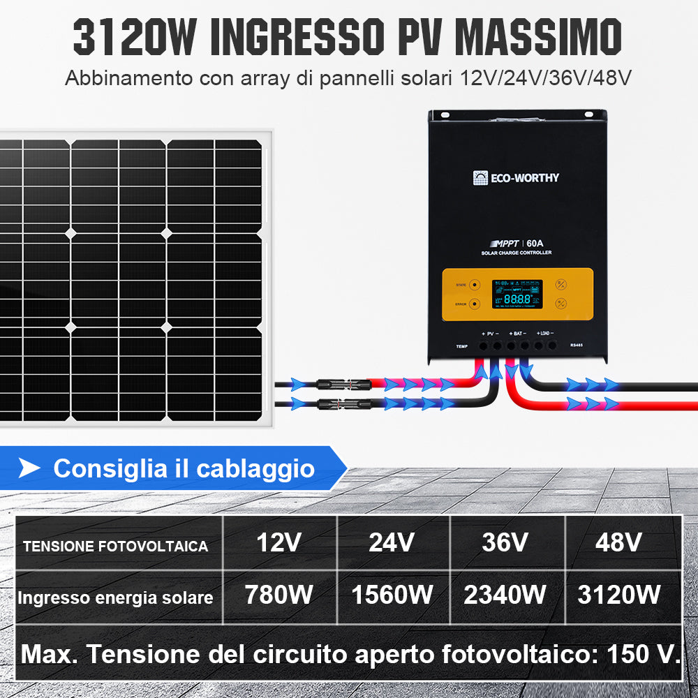 ·Rilevamento automatico della tensione di sistema a 12/24/36/48V: il regolatore di carica MPPT da 60A supporta sistemi a 12/24/36V e 48V e può rilevare automaticamente la tensione di sistema una volta collegato a batterie sigillate, al gel, AGM e al litio.