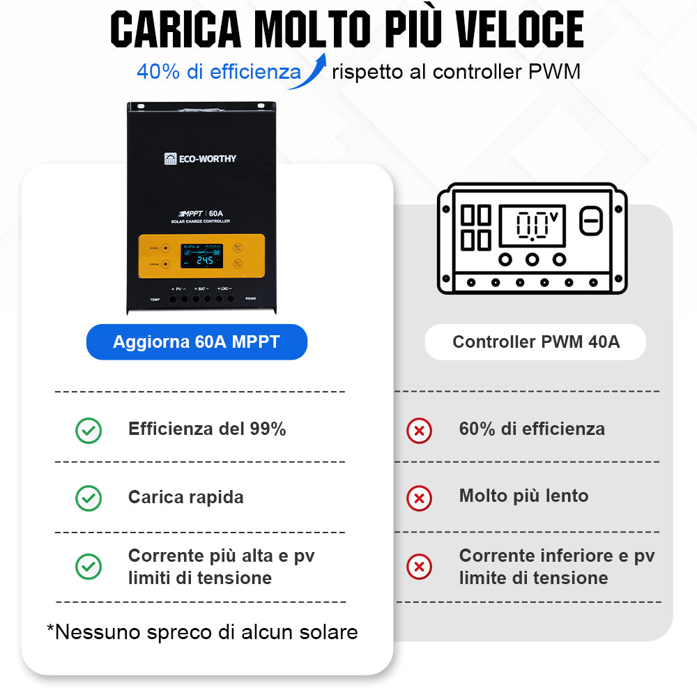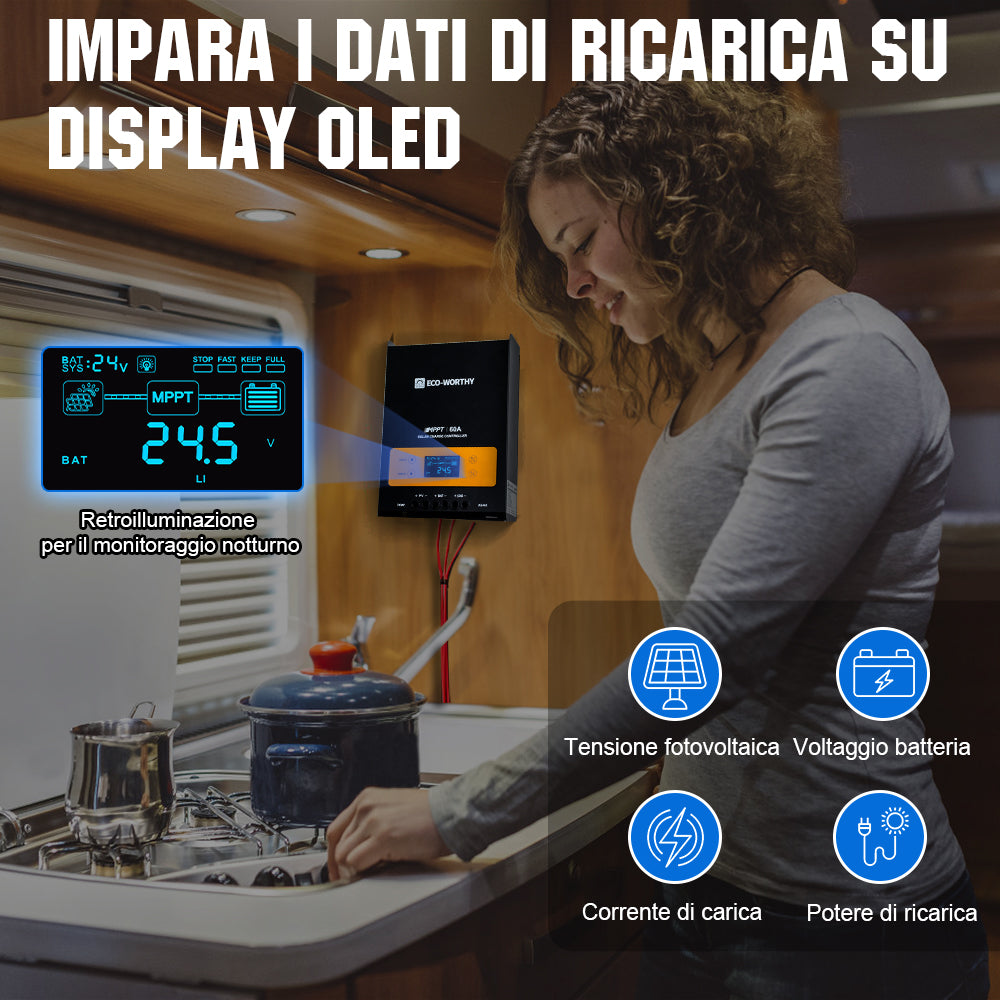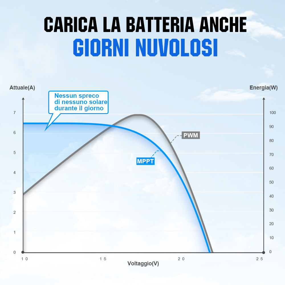 ·Protezione di carica intelligente: questo regolatore di carica MPPT offre una carica a 4 stadi (Bulk, Absorption, Float ed Equalization) e dispone di un set completo di protezioni elettroniche, come la prevenzione di sovraccarico e scarica eccessiva, sovratensione del pannello solare, sovraccarico, cortocircuito e protezione da inversione di polarità.