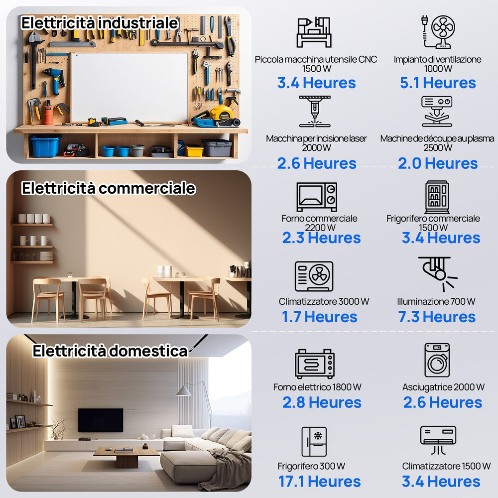 Se hai installato un impianto fotovoltaico a casa, puoi dare priorità alla ricarica delle batterie utilizzando il sistema off-grid. Puoi anche scegliere di caricare le batterie tramite la rete elettrica CA. Velocità di ricarica: fino a 40 A per la ricarica CA, con una carica completa in 2,5 ore; fino a 100 A per la ricarica FV, con una carica completa in 1 ora. Si carica più velocemente di qualsiasi altra fonte di energia di backup da 5 kWh.