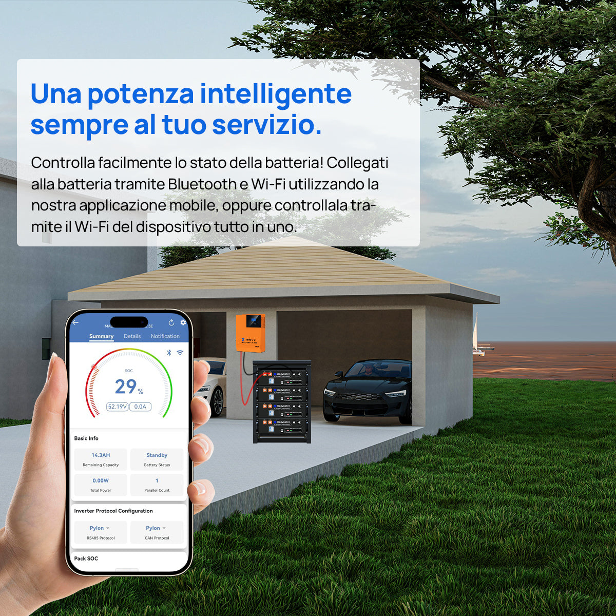1 batteria al litio da 48 V 100 Ah con Bluetooth e Wi-Fi