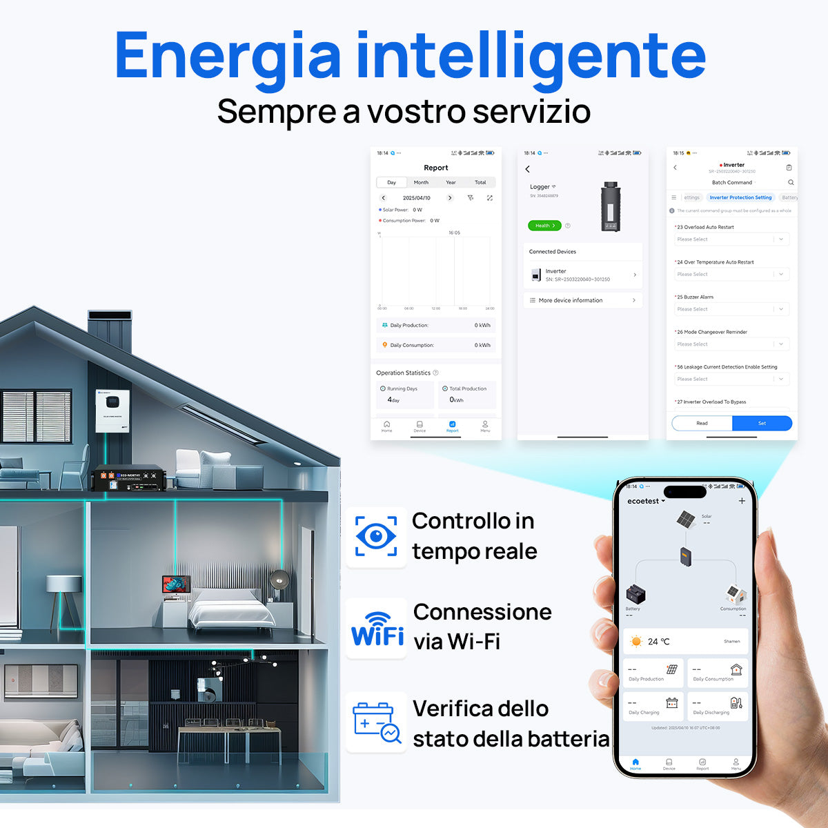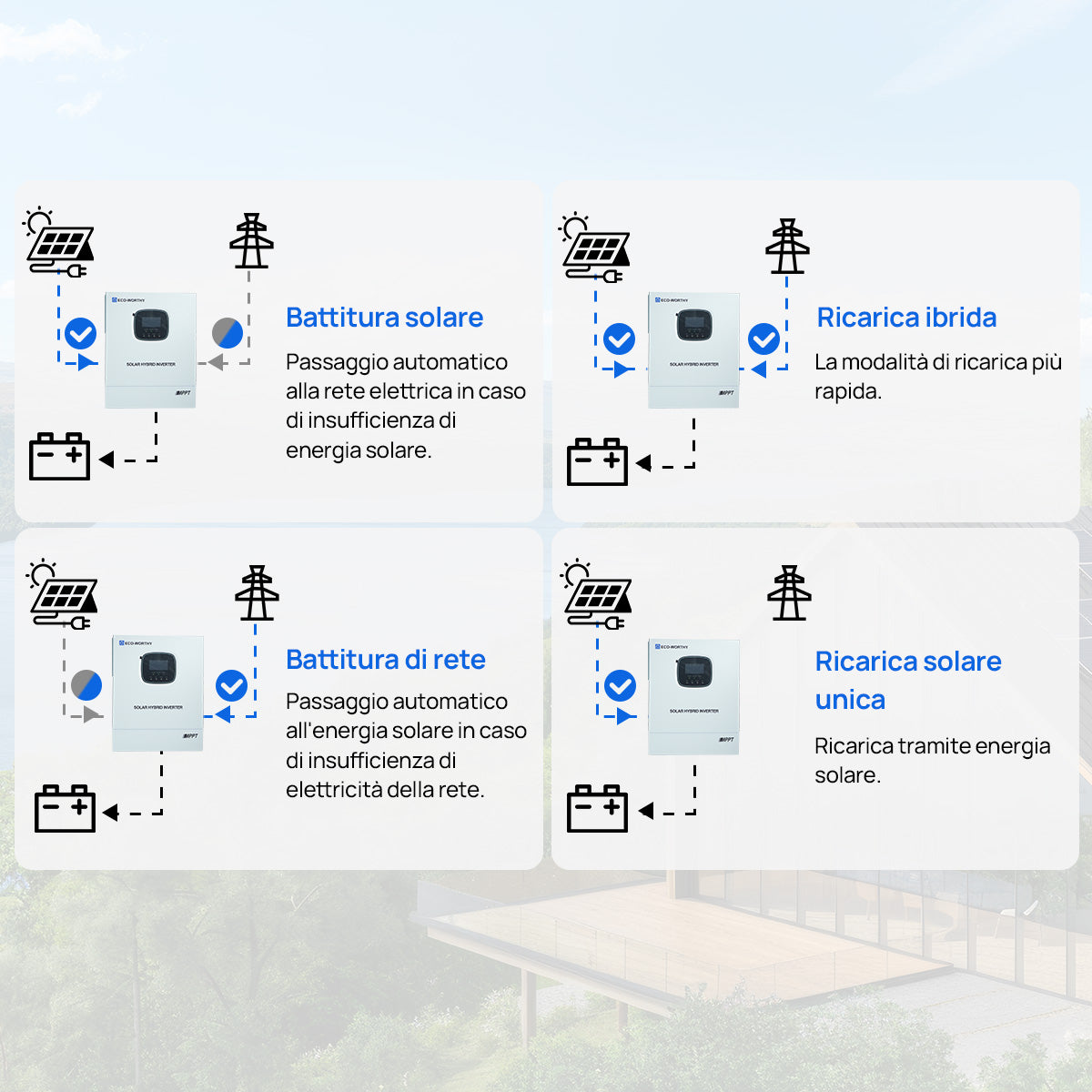 La funzionalità UPS integrata garantisce un passaggio senza interruzioni all'alimentazione a batteria durante le interruzioni di rete. Stabilisci la priorità tra la modalità rete e quella inverter per mantenere l'alimentazione ininterrotta della tua casa.