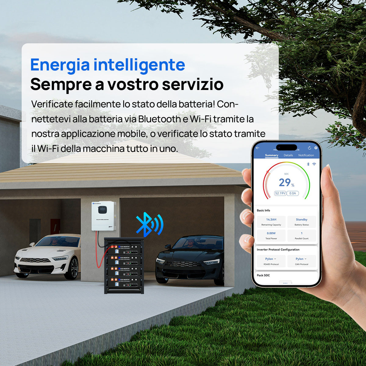 Ogni batteria LiFePO4 da 48 V 100 Ah è dotata di celle di Grado A, comunicazione CAN/RS485, monitoraggio Bluetooth e WiFi. Dotata di un BMS da 100 A e di un interruttore pneumatico da 125 A per una sicurezza avanzata. Disponibile versione opzionale per montaggio su rack 3U.