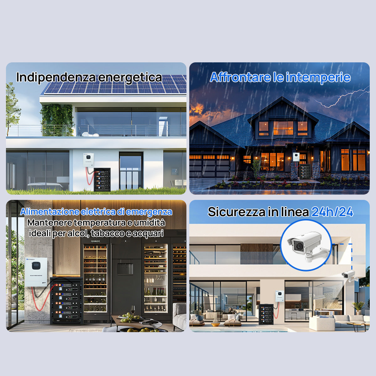 Sistema di conversione dell'energia solare o connesso alla rete elettrica con efficienza ottimale. Una batteria da 5,12 kWh può fornire fino a 5,12 ore di autonomia a 1 kW, garantendo prestazioni stabili e una maggiore durata della batteria in caso di interruzione di corrente.
