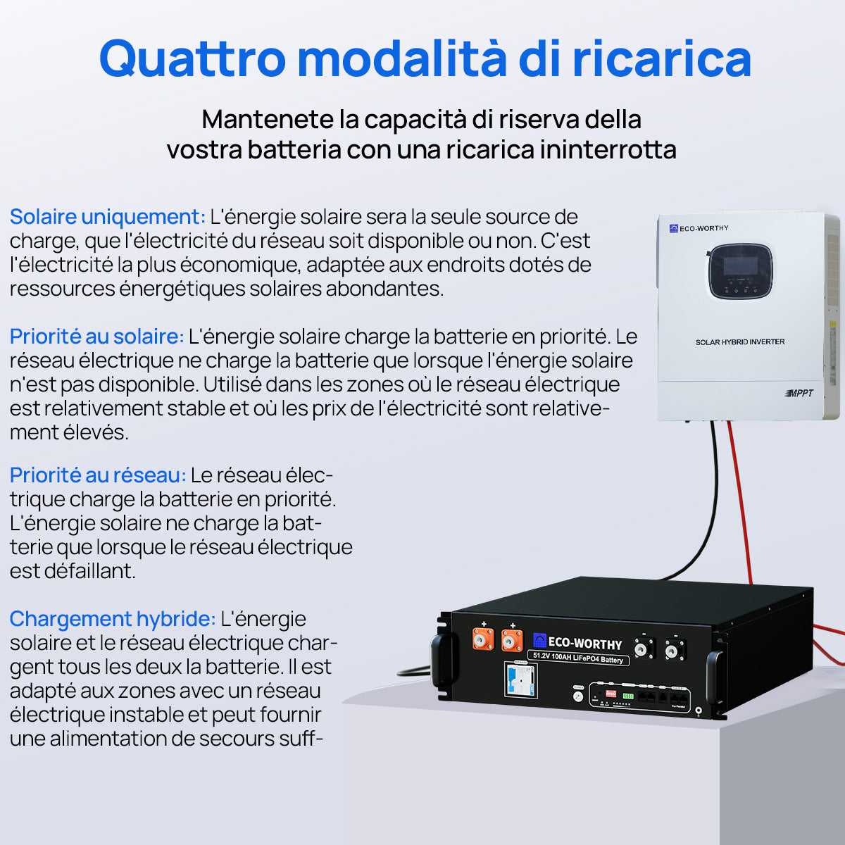Ottimizza il tuo sistema energetico con una batteria LiFePO4 da 48 V e 100 Ah abbinata a un UPS all-in-one da 3000 W, per una soluzione di alimentazione di backup efficiente e stabile da 5,12 kWh. Ideale per abitazioni e piccole imprese, offre un'alimentazione di backup durevole, sicura e affidabile per aiutarti a gestire facilmente le interruzioni.