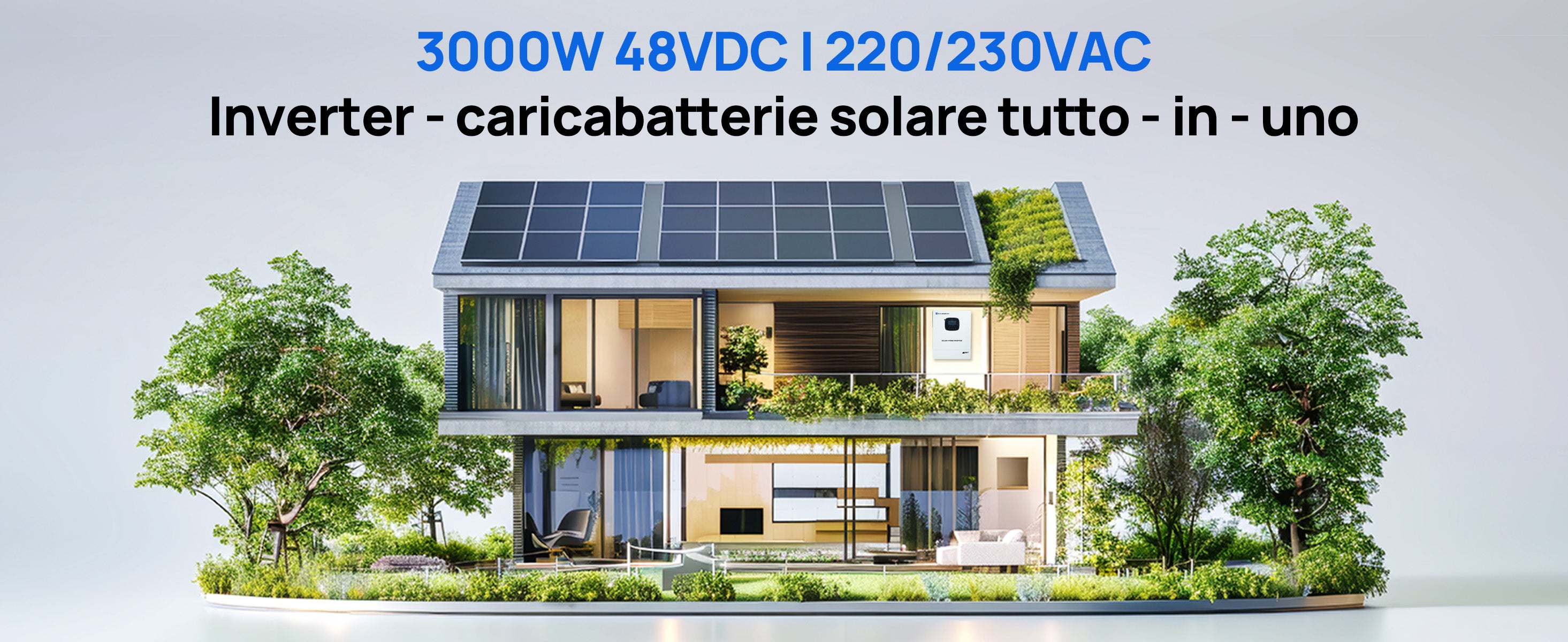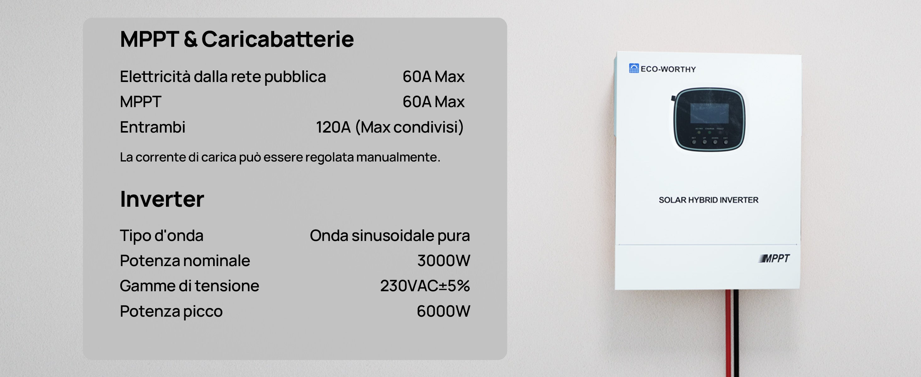 Potenza, efficienza e indipendenza energetica in un’unica soluzione. L’inverter ibrido ECO-WORTHY 48V 3000W è progettato per offrire un’alimentazione stabile e affidabile, combinando ricarica solare MPPT, ingresso da rete e uscita a onda sinusoidale pura. Ideale per sistemi fotovoltaici domestici e applicazioni off-grid, consente di ottimizzare l’uso dell’energia e ridurre la dipendenza dalla rete elettrica. Grazie alle 4 modalità di ricarica intelligenti e all’elevata efficienza energetica, puoi adattare facilmente il sistema alle tue esigenze quotidiane. Il design compatto e la semplice installazione lo rendono perfetto per abitazioni, officine o case di campagna. Una soluzione affidabile per alimentare i tuoi dispositivi essenziali, ovunque tu sia.