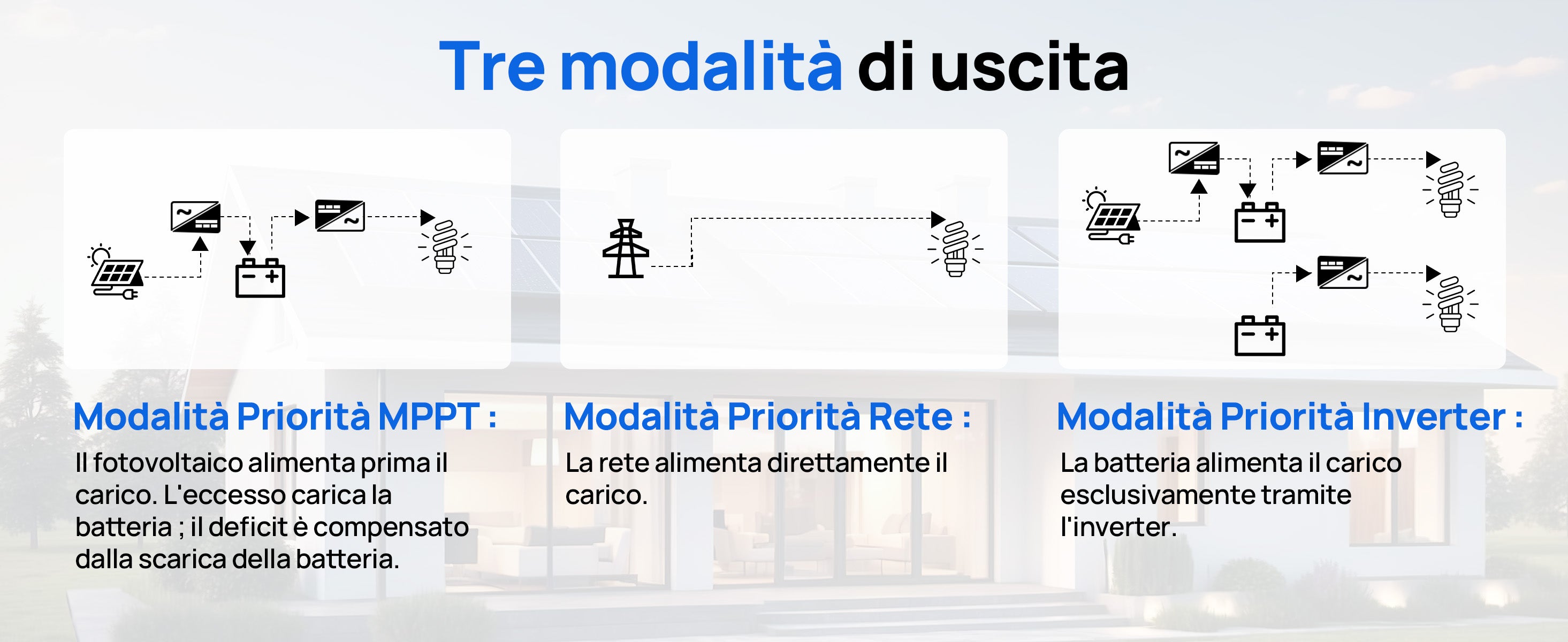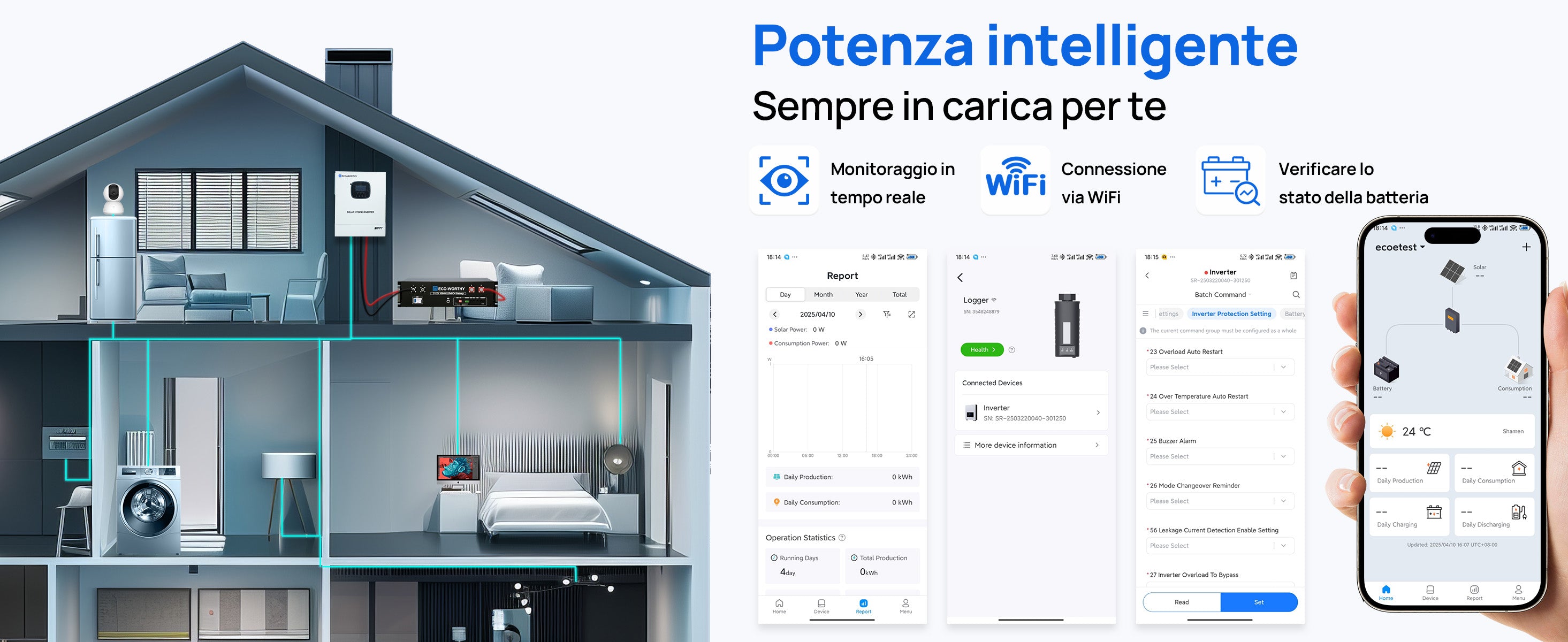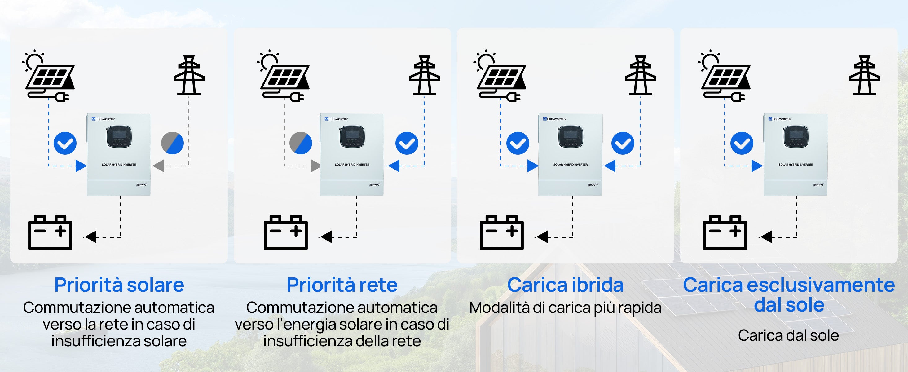 · Quattro modalità di ricarica intelligenti: solo solare, priorità rete, priorità solare e modalità ibrida