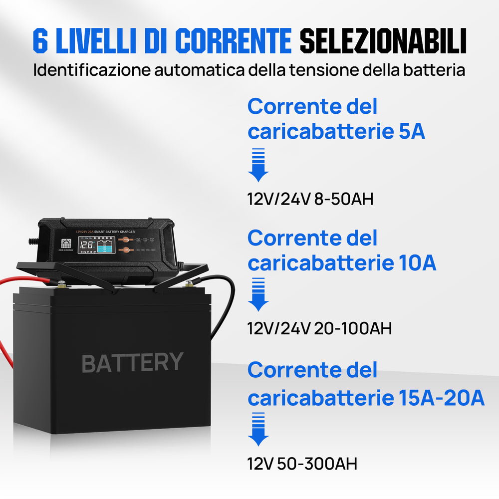 --Rilevamento intelligente della tensione: può rilevare automaticamente la tensione della batteria 12V/24V e supporta la selezione manuale della corrente di carica. La corrente di carica può essere regolata in base alla capacità della batteria, il che significa che sono ben supportate batterie di diverse capacità.
