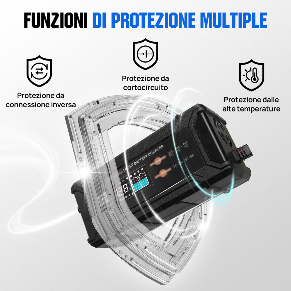 --Funzioni di protezione complete: come B. Inversione di polarità, cortocircuito, temperatura elevata della batteria, ecc., alloggiamento e cavo realizzati in materiale ignifugo di classe V0.