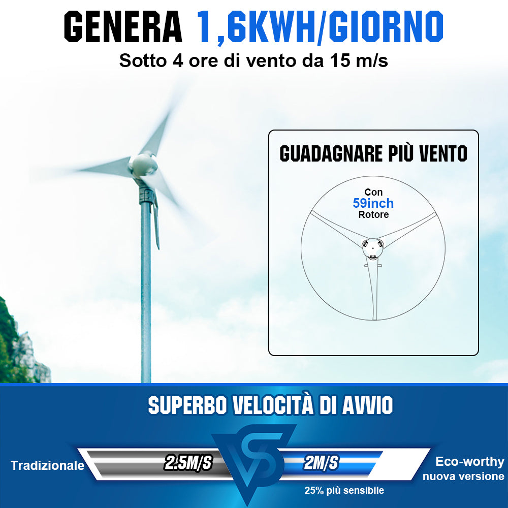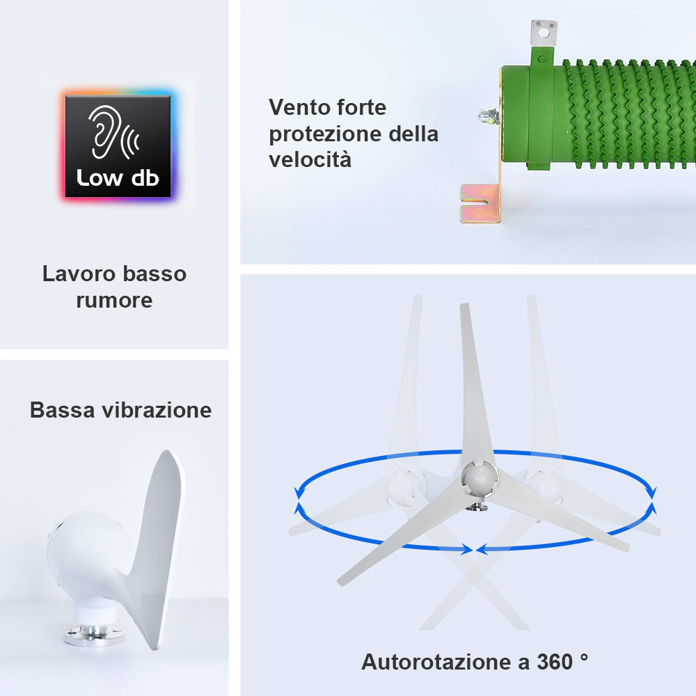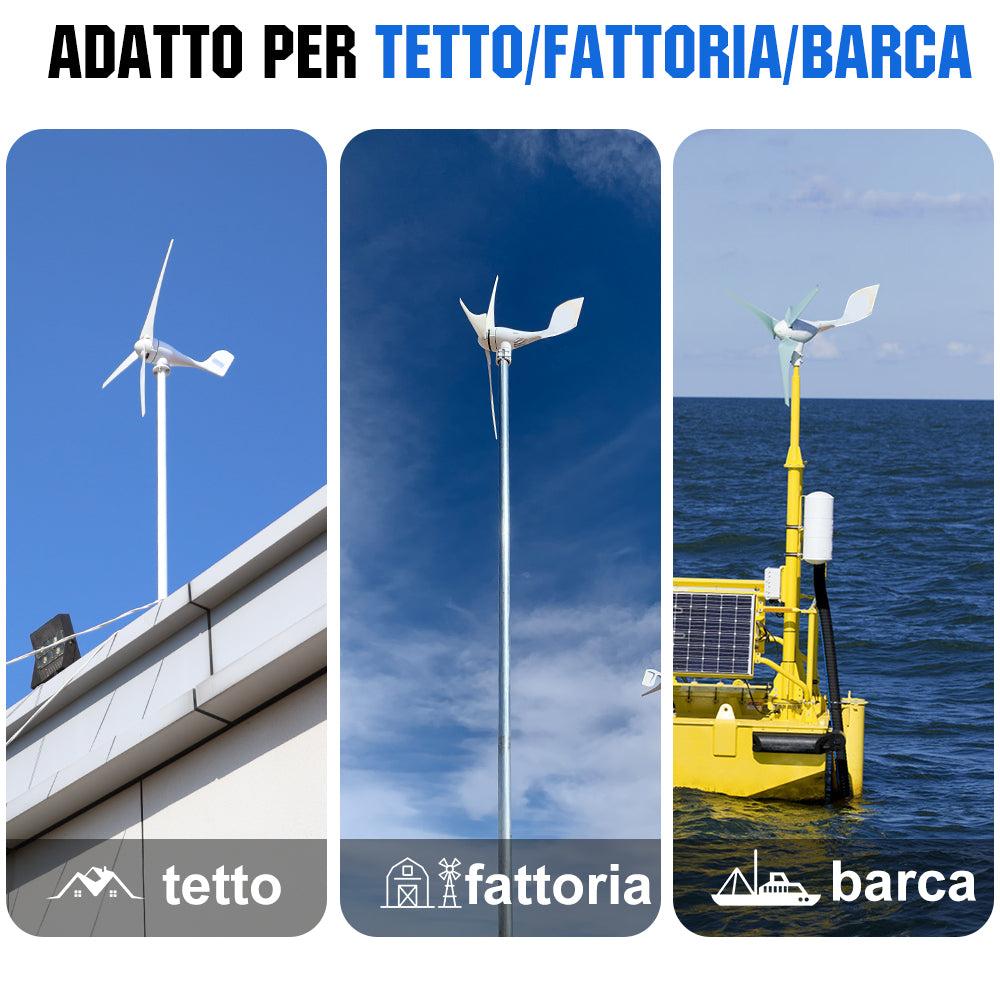 La turbina eolica ECO-WORTHY 400W 12V/24V è una scelta intelligente e conveniente per case remote e cottage in zone ventose. L'elettricità prodotta dall'energia eolica può essere immagazzinata in batterie per uso domestico quando necessario. I generatori eolici possono essere utilizzati da soli o possono essere utilizzati come parte di un sistema ibrido in cui la loro potenza è combinata con quella del fotovoltaico. I sistemi ibridi sono particolarmente utili per l'inverno dei sistemi domestici che sperimentano contemporaneamente tempo nuvoloso e vento.