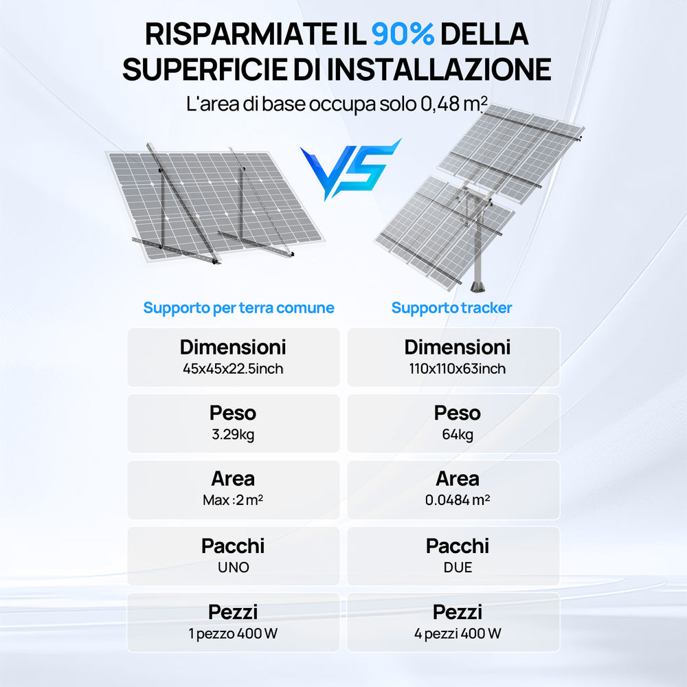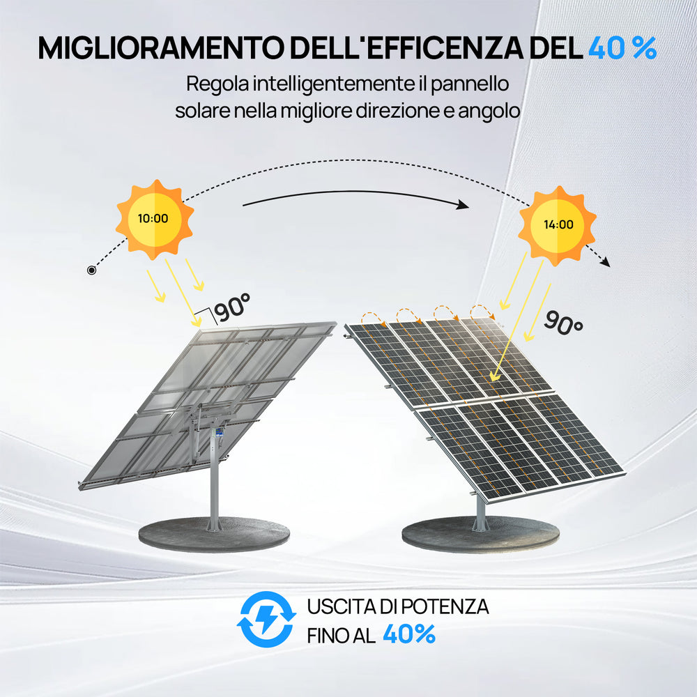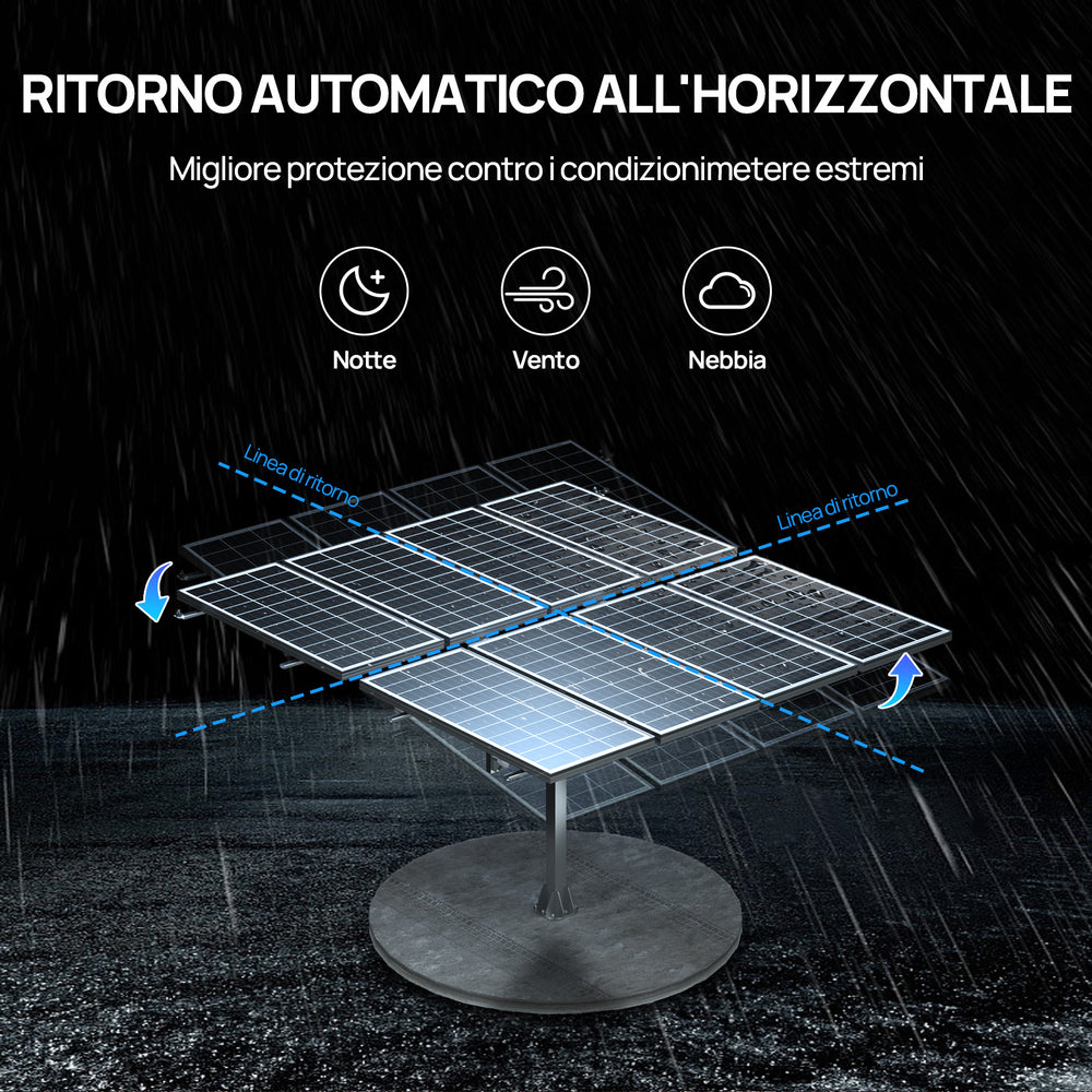 Inseguimento automatico a doppio asse: Orientare i pannelli orizzontalmente e verticalmente per catturare la massima quantità di luce solare.Aumento del fatturato (+40%): Ottieni una produzione di energia elettrica notevolmente più elevata, ideale per massimizzare il ritorno sull'investimento.