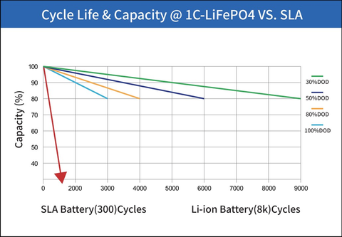 La batteria al piombo è buona per circa 2000 cicli al 50% di profondità di scarica (DOD), mentre la batteria agli ioni di litio esegue 6000 cicli allo stesso 50% DOD. Ciò significa che la batteria agli ioni di litio dura circa 3 volte di più! Quindi esaminiamo la durata della batteria, scambiando il costo di acquisizione 2x per la durata della batteria 3x.
