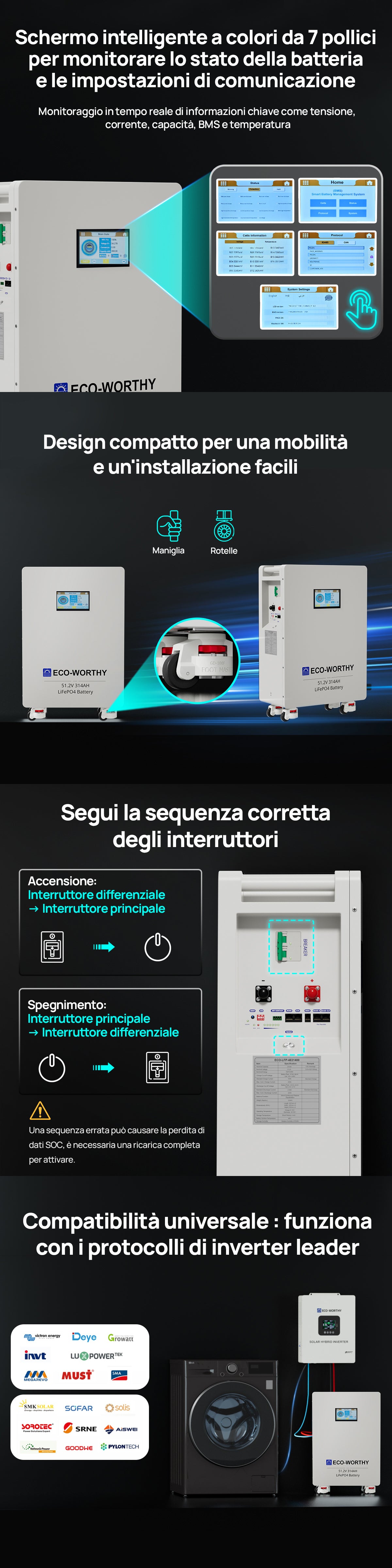[Monitoraggio intelligente, sempre sotto controllo]: Tieni tutto sotto controllo grazie al monitoraggio in tempo reale dello stato della batteria tramite app Bluetooth/Wi-Fi o connessioni CAN/RS485/RS232. Compatibile con i più comuni inverter solari all-in-one. Il display LCD a colori da 7 pollici mostra in modo chiaro tensione, stato di carica (SOC), temperatura e stato del BMS.