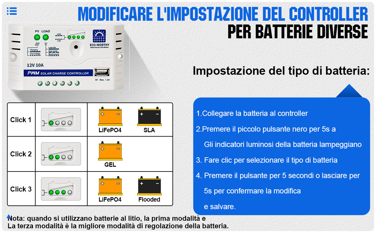 Potere stimato: 12V/24V | Corrente nominale di carica / scarica: 10A |