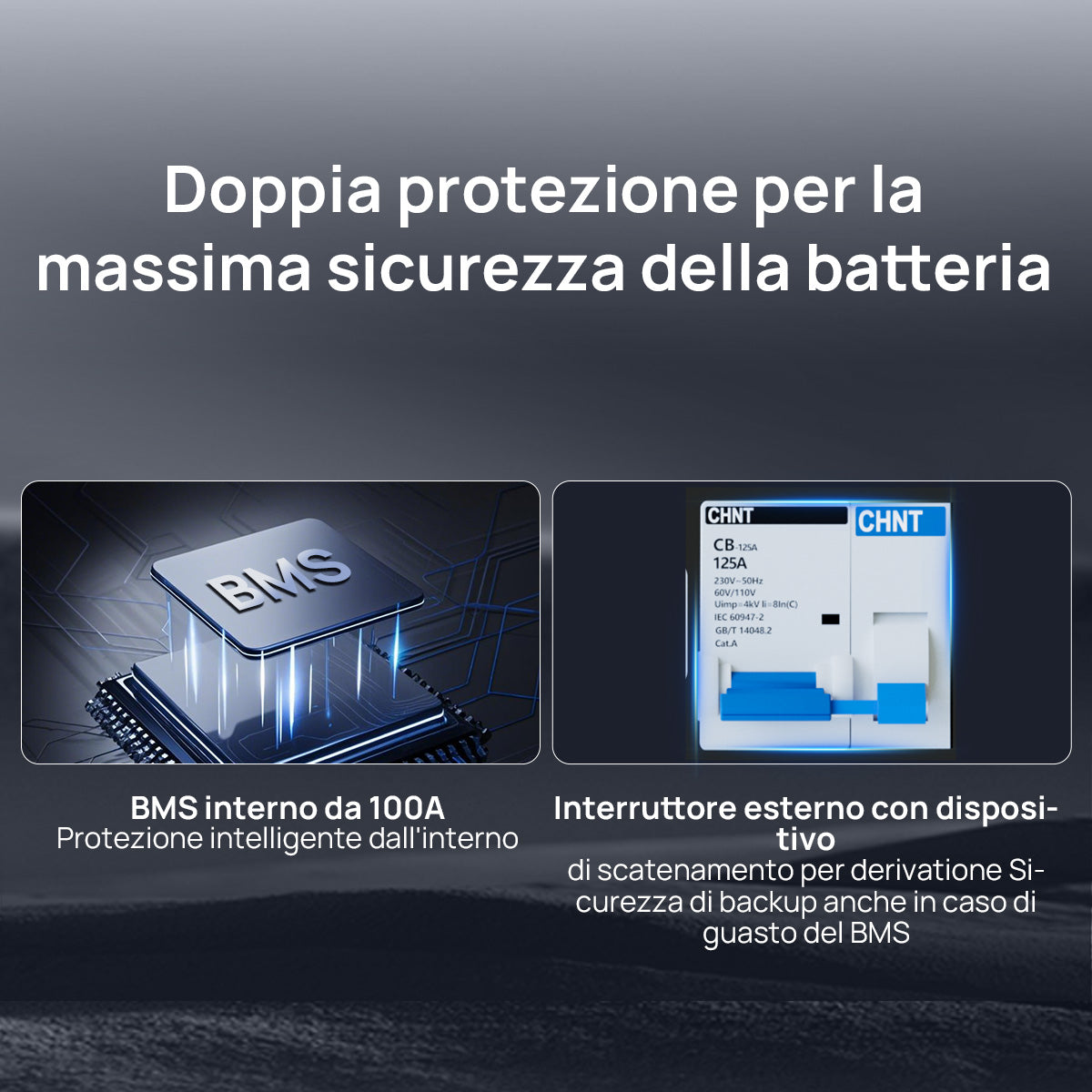 3. Sicura e costruita per durare – Solido involucro metallico con BMS da 100A, interruttore automatico da 125A e interruttore manuale di alimentazione. Include protezione per la ricarica a bassa temperatura e sistemi multipli contro sovraccarico, sovrascarica, cortocircuito e surriscaldamento.