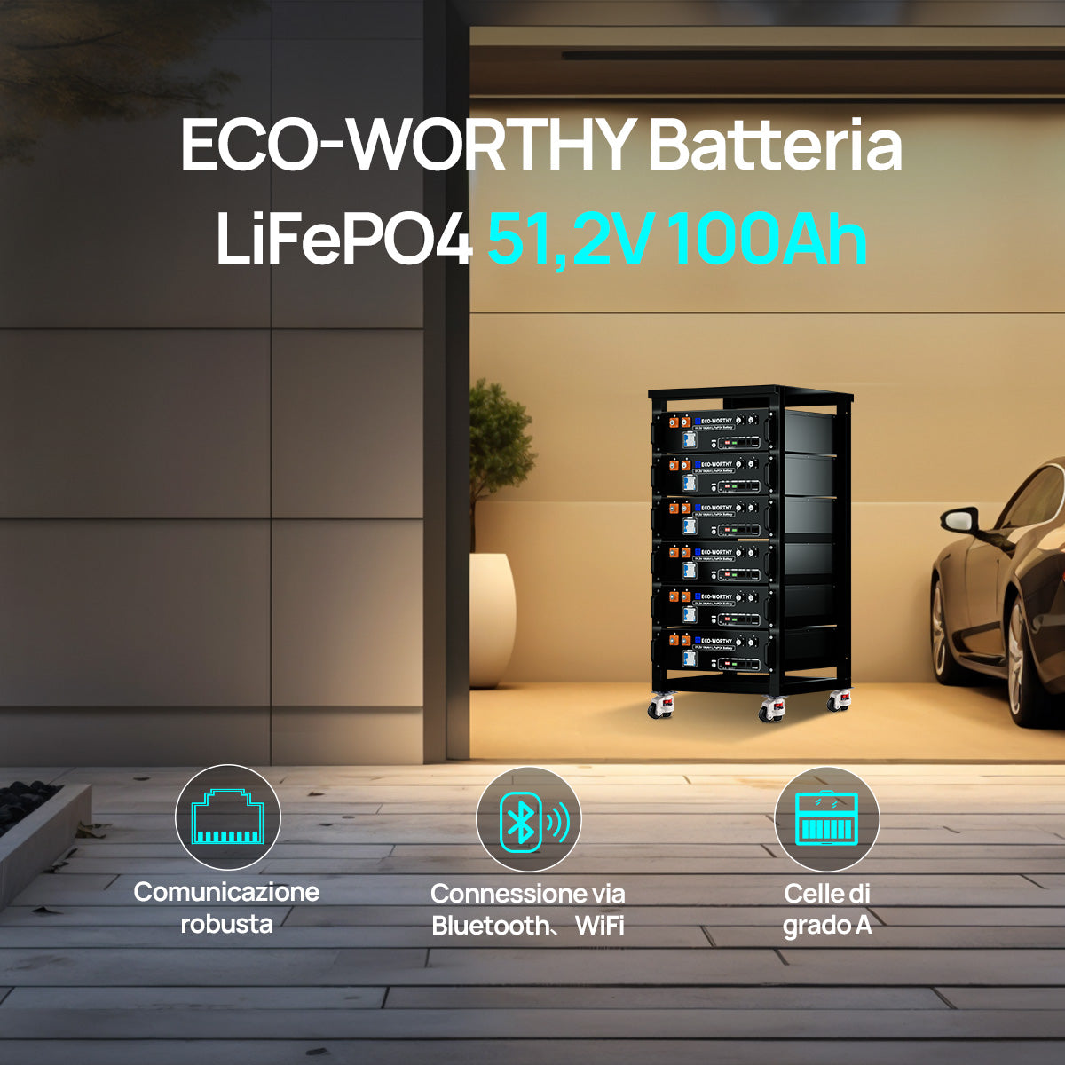 2. Monitoraggio intelligente, sempre e ovunque – Controlla in tempo reale tensione, corrente, SOC e capacità tramite l’app Eco-Worthy (Bluetooth/WiFi). Dotata di interfacce RS485, RS232 e CAN per un’integrazione perfetta con i principali inverter ibridi come Victron e Growatt.