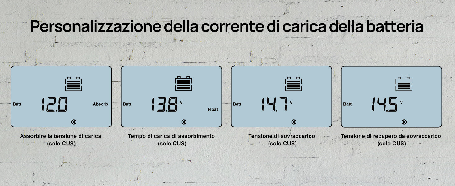 ·Compatibile con tutte le batterie: compatibile con tutte le batterie da 12V e 24V, supporta i parametri personalizzati della batteria (modalità CUS) e consente una facile selezione dei tipi di batteria preimpostati: LFP, FLD, SLD, GEL.