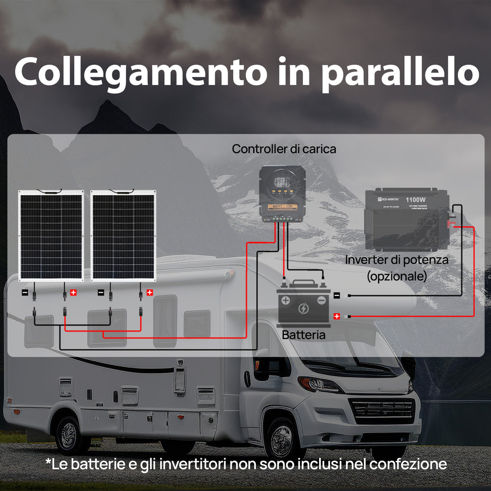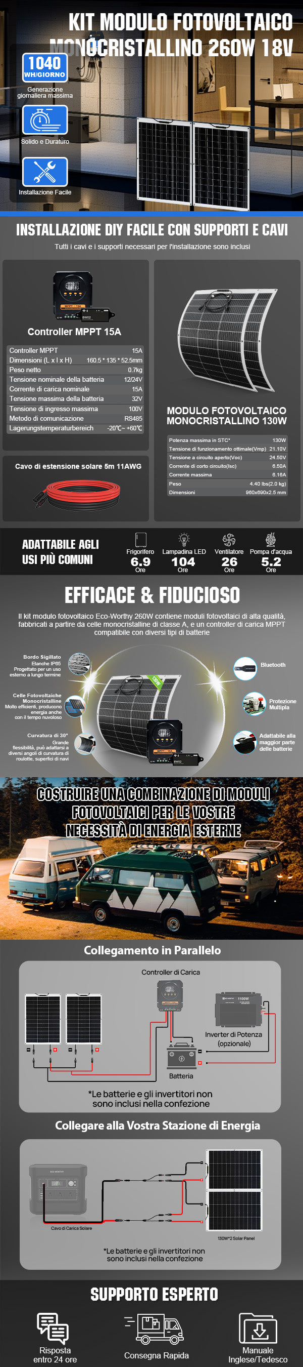Ampia gamma di applicazioni: In pieno sole, il sistema può produrre fino a 1,04 kWh di energia al giorno (circa 4 ore di esposizione). Ideale per ricaricare batterie da 12V e alimentare camper, barche, tende e tetti, anche su superfici leggermente curve.